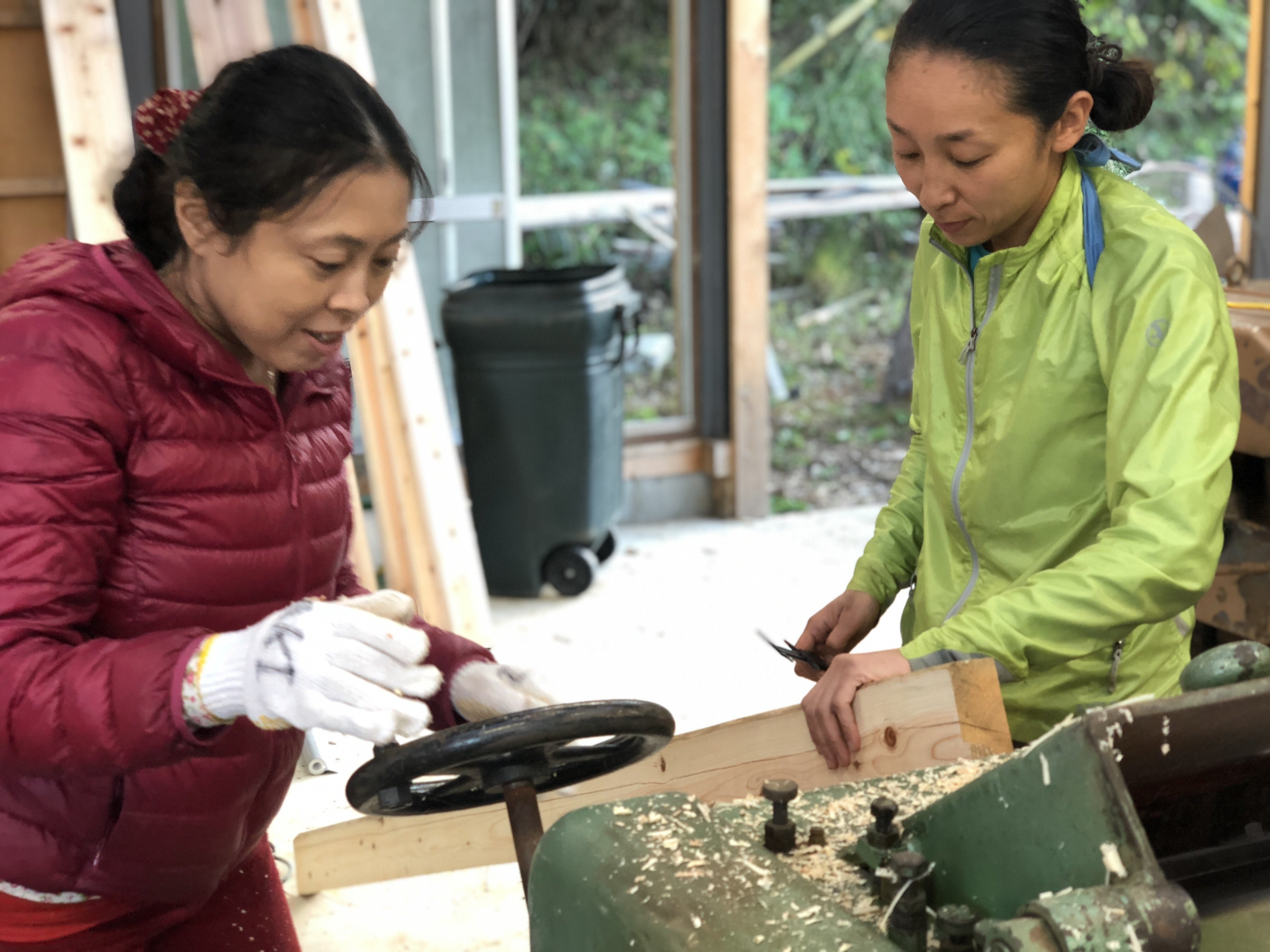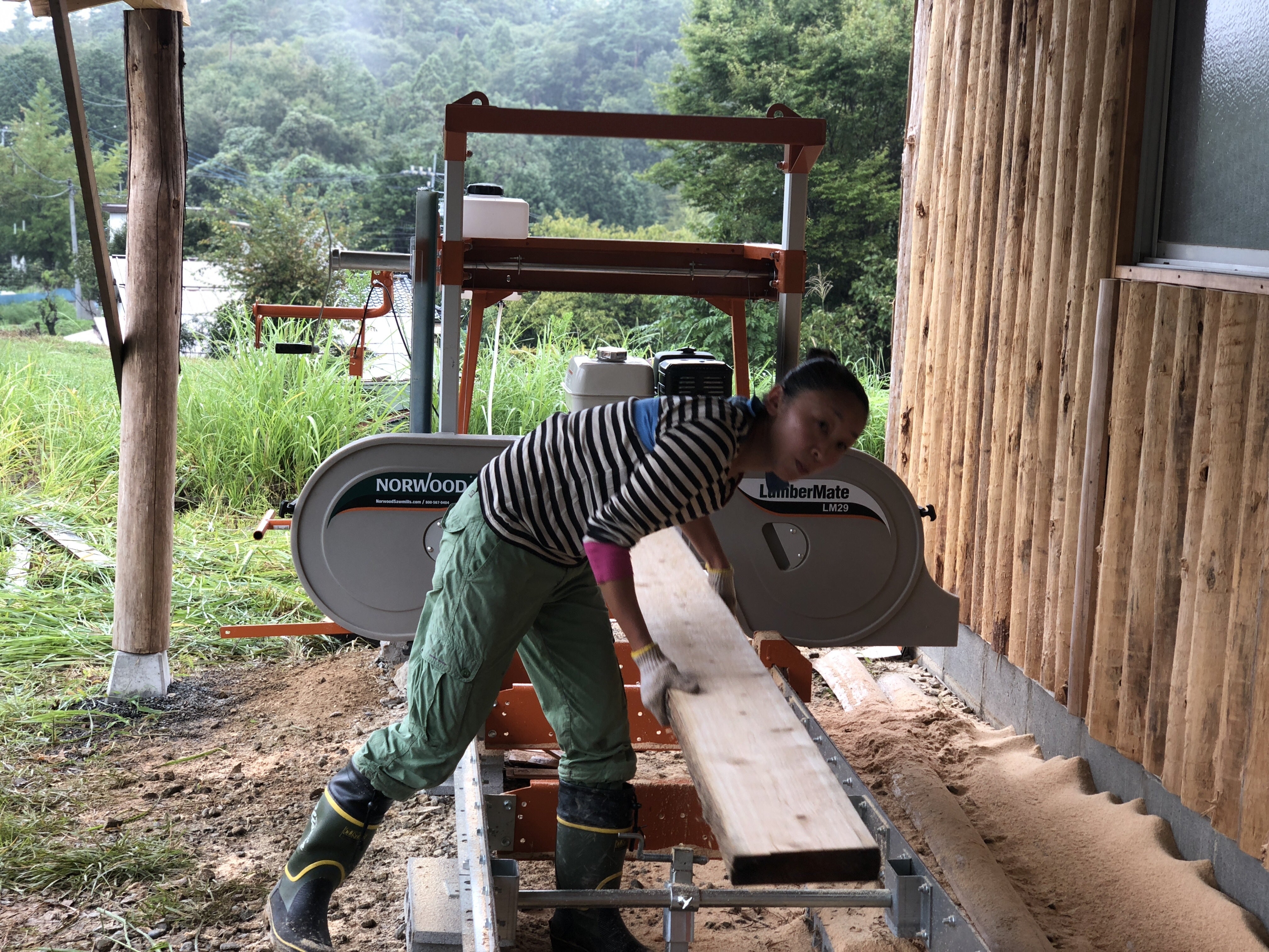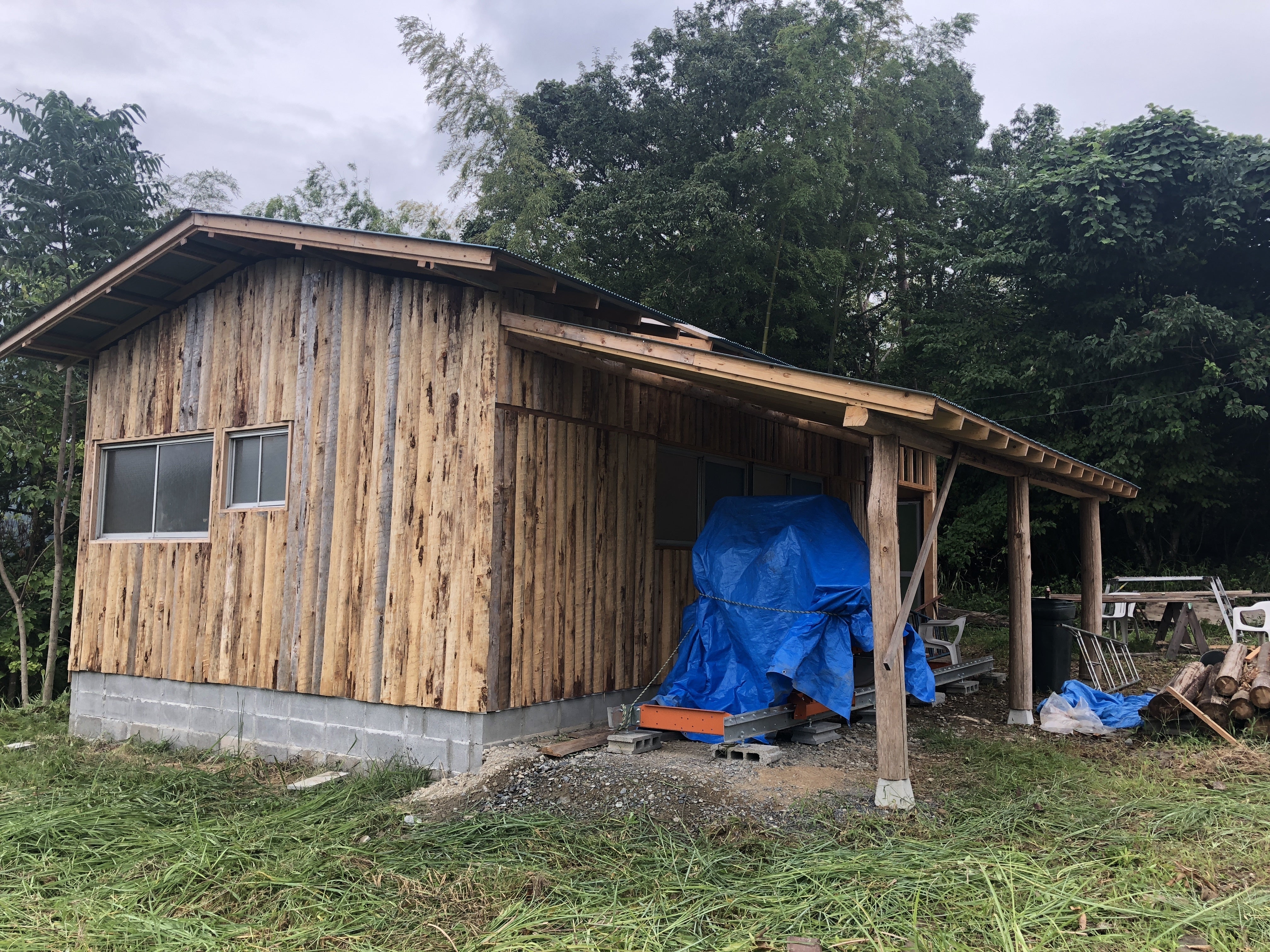 2018年 きらめ樹活動で皮剥き間伐した材を丸太から自家製材、加工の出来る工房をセルフビルドで仲間と建設。