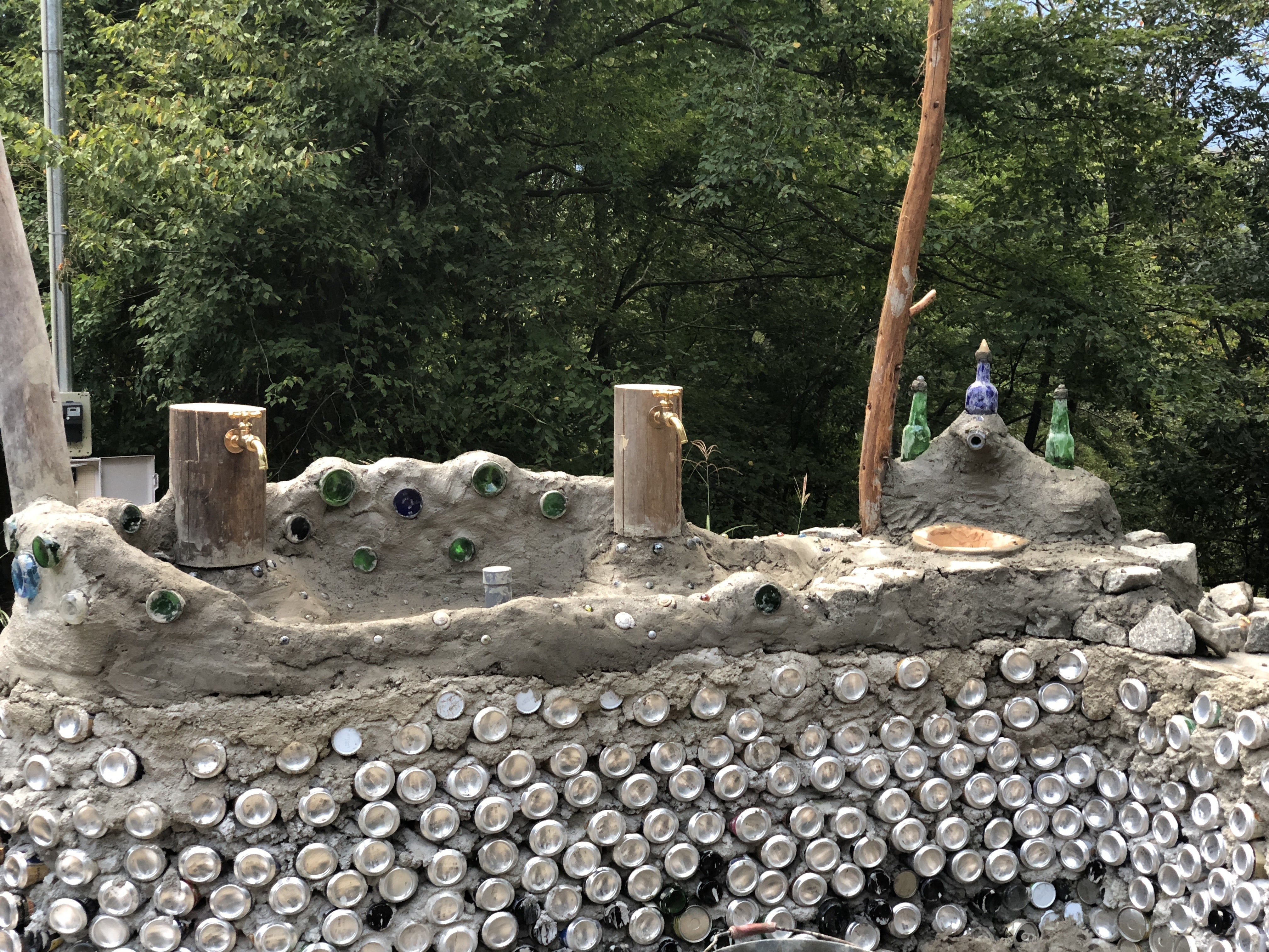 空き缶と空き瓶を再利用する方法で、見た目が可愛い、子どもの喜ぶような施設作りをしています。
