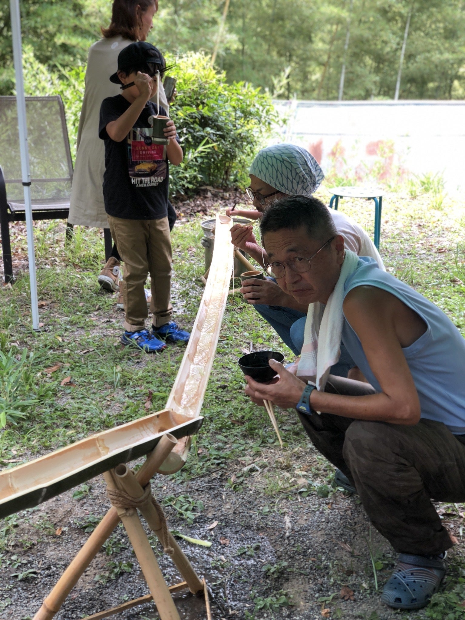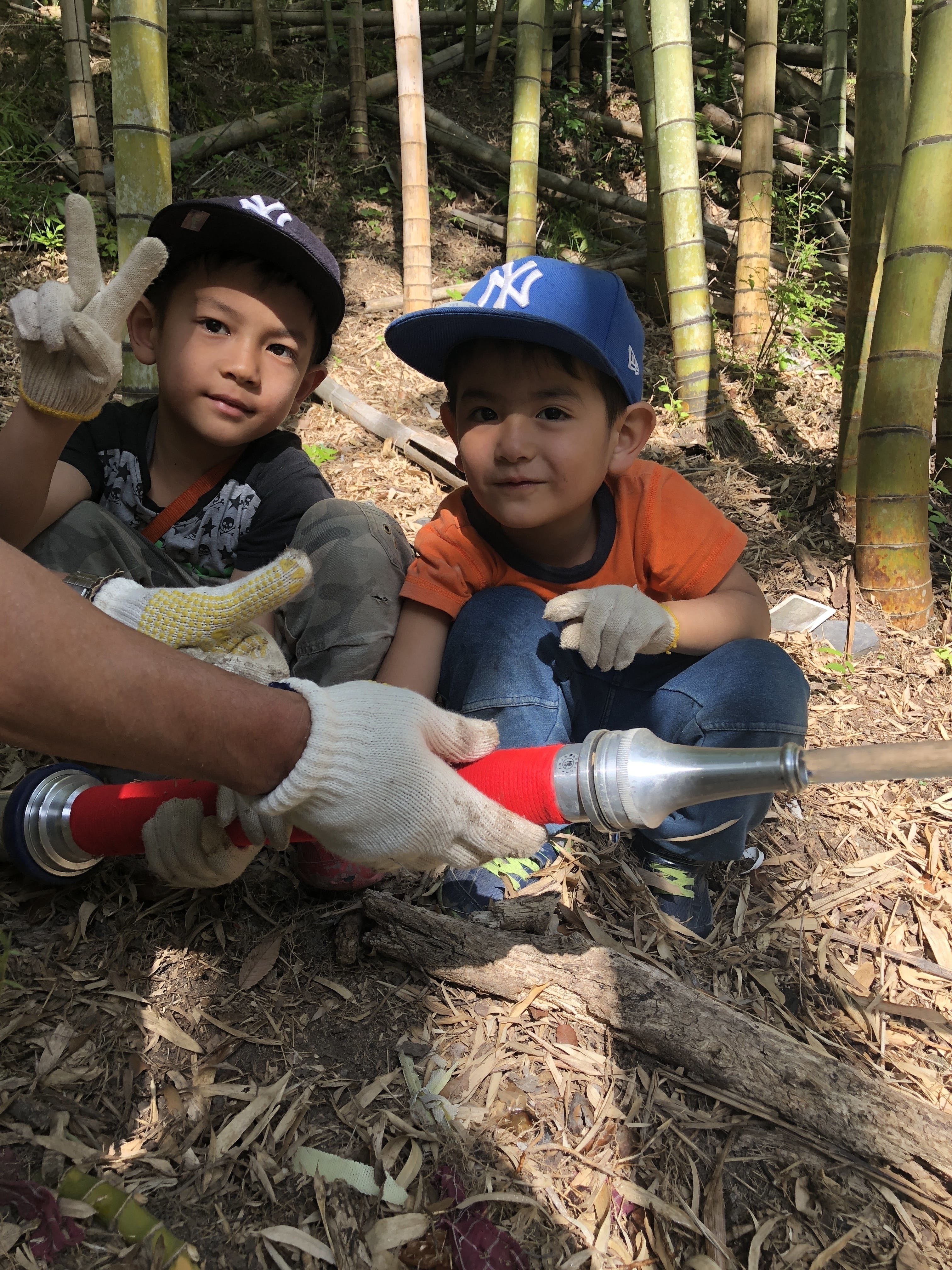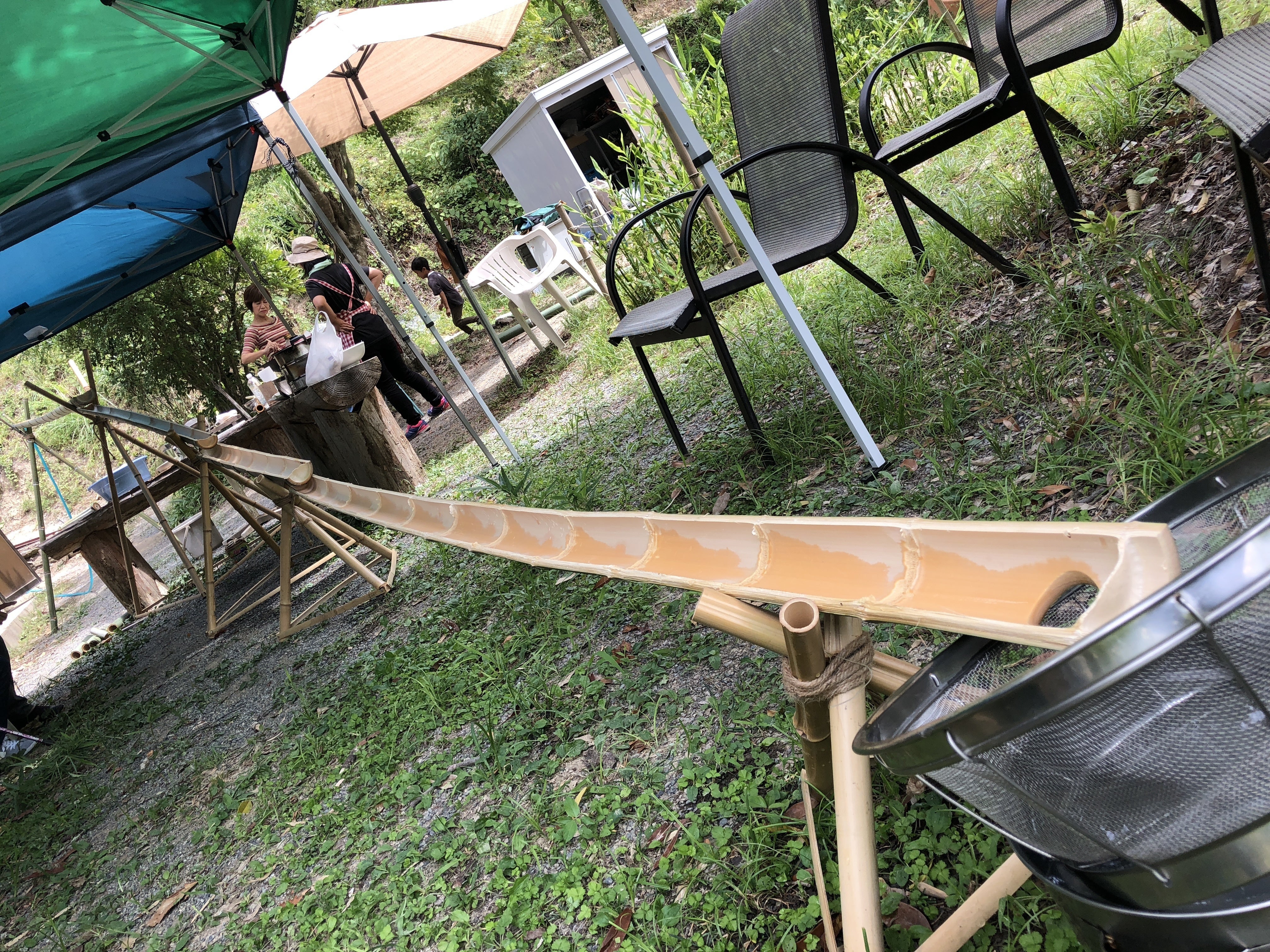 春にはタケノコ掘り、秋にはキノコ狩り。夏は山間の谷川で水遊びや虫取りキャンプをしたり、近くの竹やぶから伐採してきた竹を使っての流しそうめんも。
