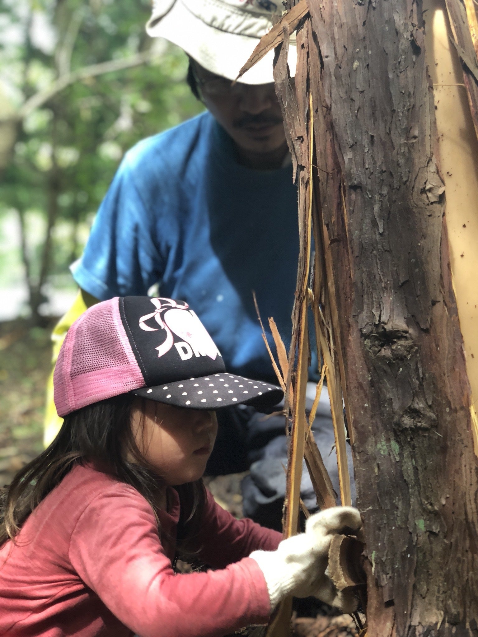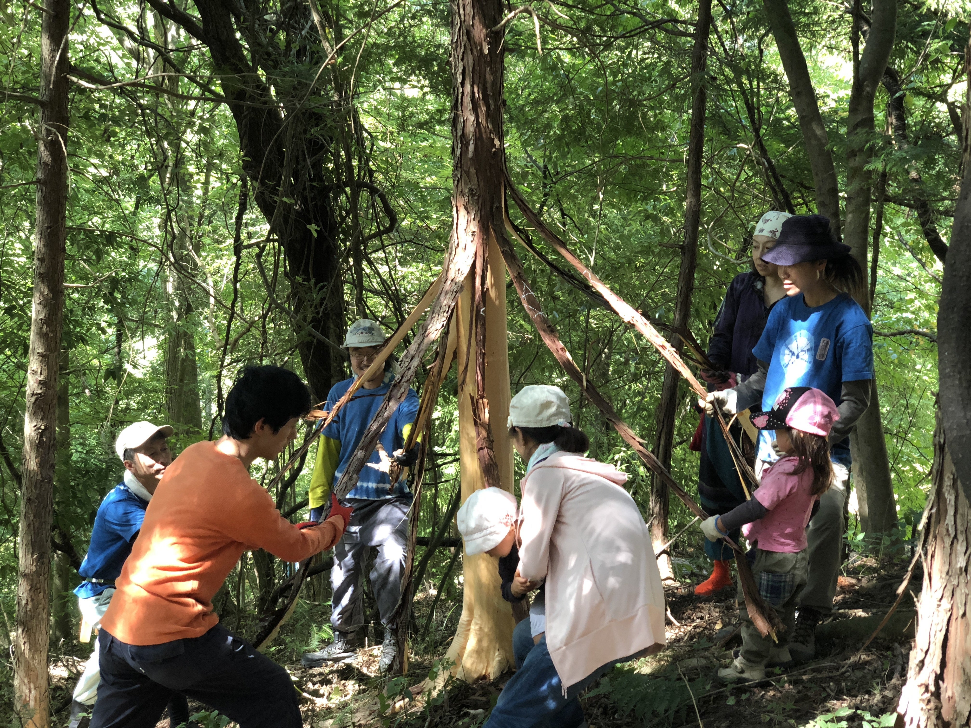 きらめ樹体験中。みんなで息を合わせ、木の根本から一気に皮を剥きます。