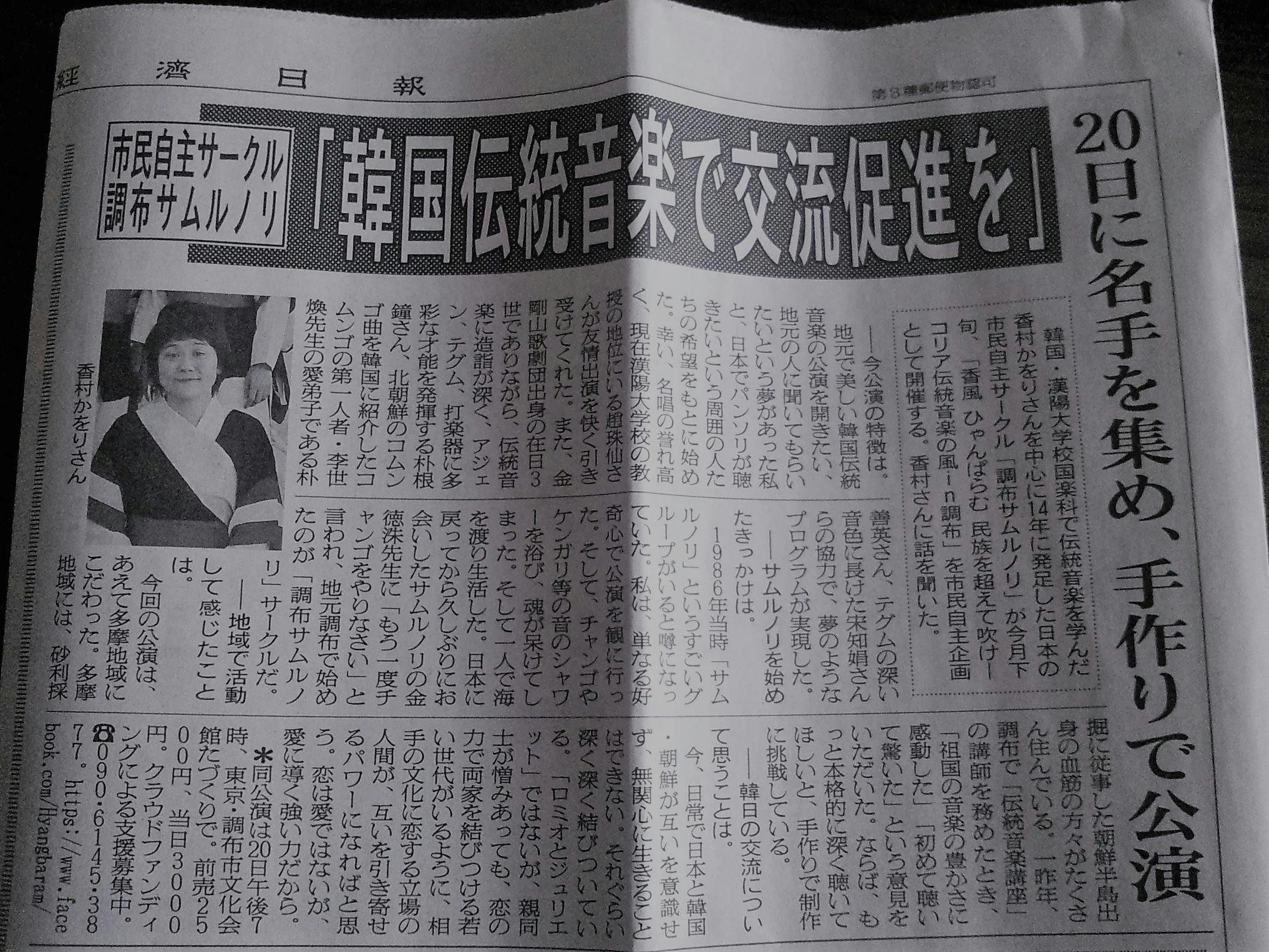 都心では、時々コリア伝統音楽のコンサートが開かれています。しかし、ここ多摩の地域では盛んであるとは言えません。多摩地域は、韓国朝鮮とゆかりの深い地域です(調布市の天然温泉もある深大寺は、渡来人「福満」の息子である僧「満功上人」が開きました。隣の狛江市の「こま」は「こま(高麗)」に由来していると言います。また多摩川一帯には、以前砂利採掘に従事した在日コリアンがたくさん住んでいる地域が点在しています)。この縁のある多摩地域で、地元の人々にこそ見てもらいたいと、地元調布で公演を開くことにこだわりました。