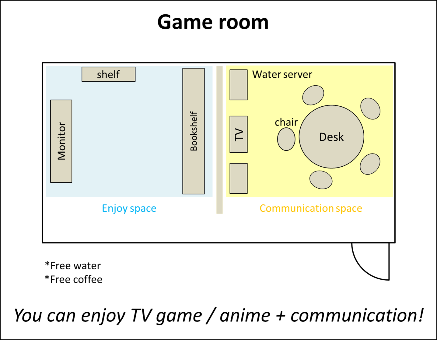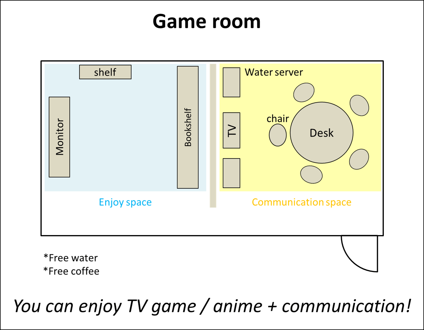 Game roomとは、日本の文化でもあるオタクの生活を体験できる部屋でありゲーム・漫画・アニメを体験できます。漫画喫茶などとの違いは、スタッフである私どもが英語を用いてコミュニケーションをとることで今までに知らなかったアニメ・ゲームを体験できることです。最終的には外国人と一緒に遊びたいと日本人の方も呼び込んでコミュニケーションスペースを提供できるようにすることが夢です。繰り返しますが日本人はコミュニケーションが苦手なわけではなく、発揮できる場が少ないだけだと考えています!