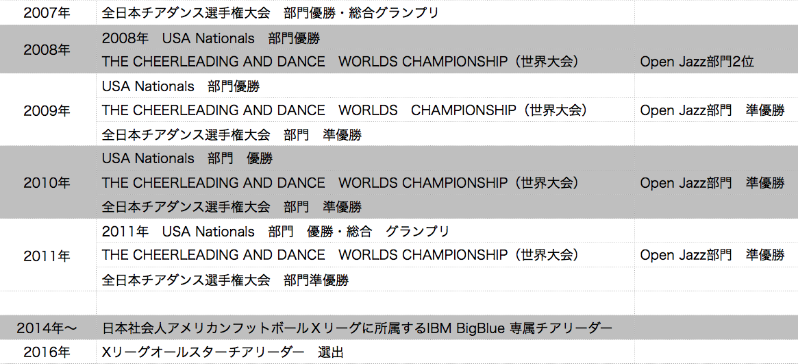日本社会人アメリカンフットボールXリーグに所属するIBM BigBlue 専属チアリーダーとして活動。2016年にはXリーグオールスターチアリーダーに選出される。