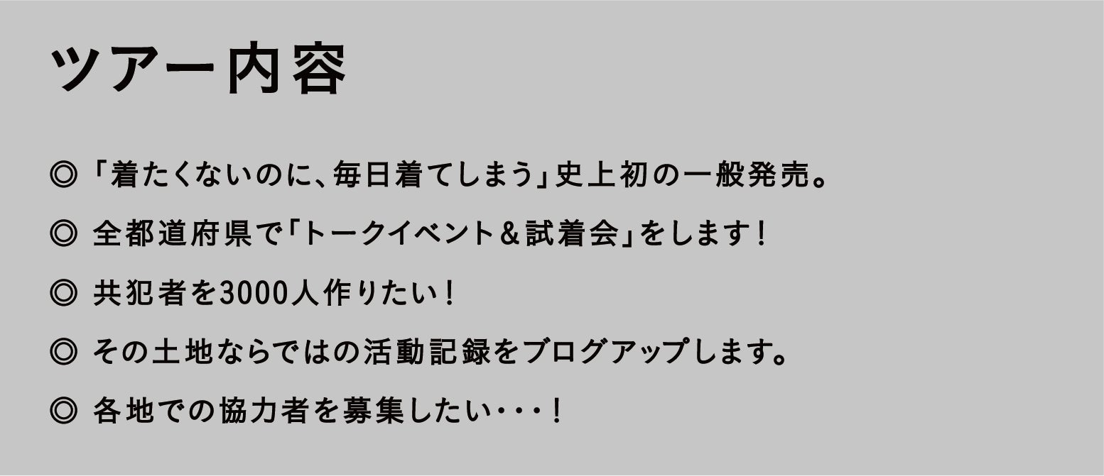このツアーで販売するプロダクト、『着たくないのに毎日着てしまう』セットアップは、僕らが47都道府県全てに配送した唯一の製品です。