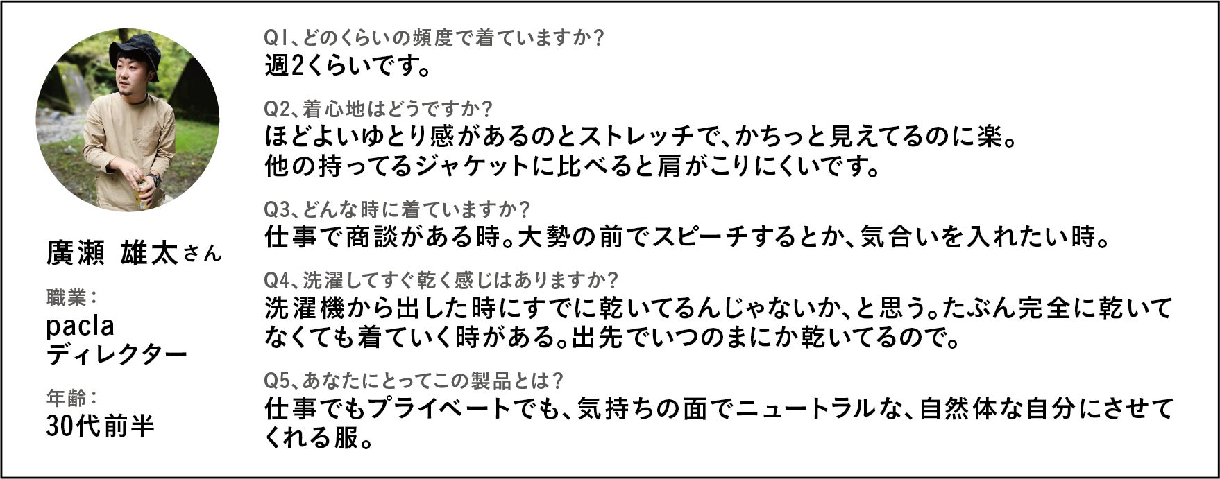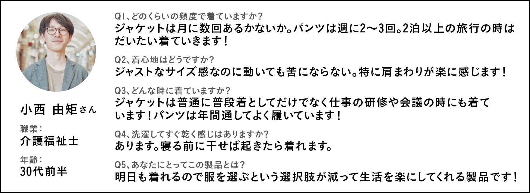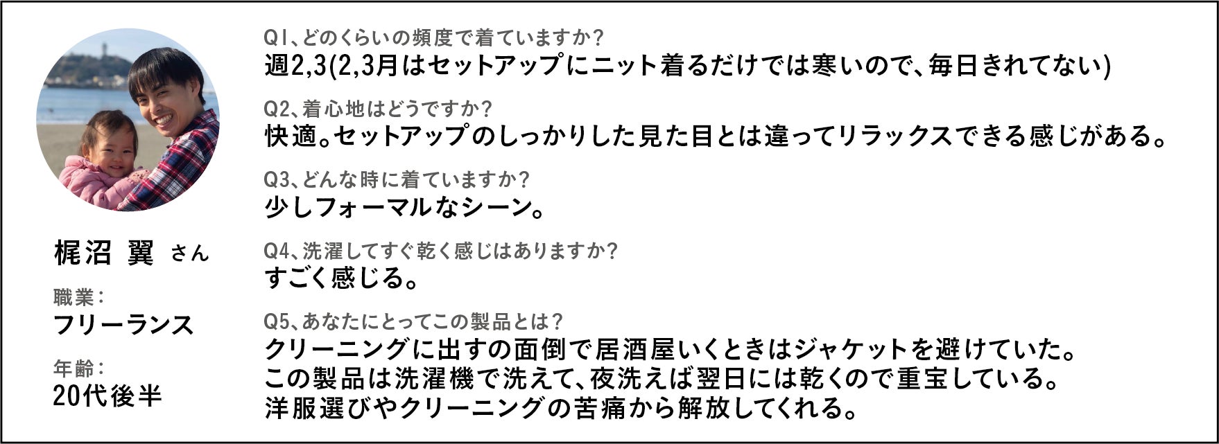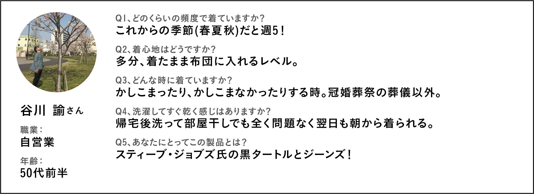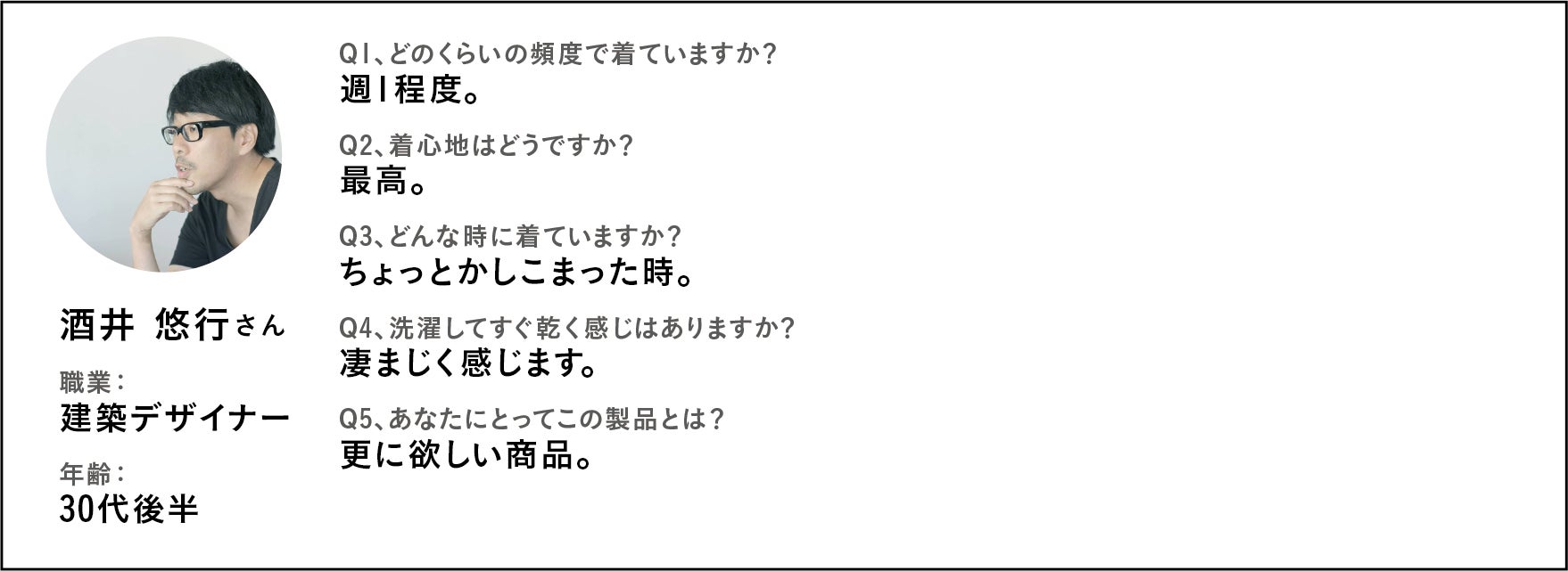 住んでいる土地の区別なく、職種の境なく着られる製品であるということを、共犯者さんが証明してくれたのです。