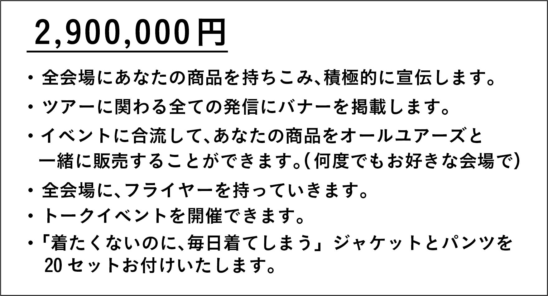 このイベントに共感してくださる全国の企業や組織、団体、コミュニティ、個人の方からのスポンサーを募集しています。僕たちがお返しできるのは、「あなたの商品やサービスを一人一人に対して丁寧に全力で伝える」ということだけです。私たちはこの全国ツアーで新たに3000人の共犯者を作りたいと思っています。あなたの商品やサービスを「より深く、一人一人の人たちに理解してほしい。」とお考えの方には、本当におすすめです!!