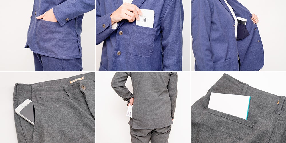 ジャケットとパンツ合わせて10のポケットがついています。ある程度の荷物(スマホ・サイフ・ペットボトルなど)なら、カバンを持つ必要がなくなります。