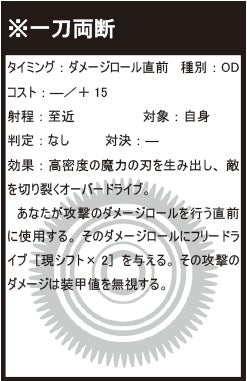 ▼公式サイトはこちらhttps://oracleengine.tumblr.com/ Fumctoryです。ゲーム中の重要度がそんなに高くないことから後回しにし、すっかり忘れていましたが、今回は大技「オーバードライブ」の解説です。▼オーバードライブオーバードライブは、オラクルエンジンを共鳴状態にし、オラクルウェポンの性能を限界以上に引き出す技です。大量のオラクルを注ぎ込むことで使用する技であり、その効果はとても大きいものです。しかしオラクルを大量消費する都合上、どうしても隙が生まれる、という欠点があります。通常のオーバードライブは、使用のためにオラクルを15~20点消費しますが、これは通常のダイス増加に換算すると+5D6~6D6相当です。ですが、オーバードライブで増加するダイス量は10D6以上になることも珍しくありません。オラクルそのままで使用すれば、どんなダイスでも増やせるという汎用性があります。しかしオーバードライブは、そのオーバードライブに決められた目的のためならば、普通にオラクルを使用するよりも優れた効率を発揮します。オーバードライブの欠点としてはもうひとつ、オラクルエンジンのシフトによって効果が増減するために不安定である、ということも言えます。例えば画像の《※一刀両断》は、攻撃のダメージが装甲値を無視する効果に加えて、シフト6ならダメージロール+12D6にもなりますが、シフト1ならダメージロールの増加量はたった+2D6です。普通にオラクルを使えば、ダメージロールに+2D6するのに必要なオラクルは3点。しかし《※一刀両断》の使用に必要なオラクルは15点。全く割に合わないことがわかります。「高いシフトを維持する」「オーバードライブを使用できるタイミングを待つ」「代償となるオラクルを確保する」と手間のかかるオーバードライブですが、うまく使えば非常に強力です。とはいえ、オーバードライブを一切使用しないままに堕落獣を倒してしまうことも珍しくありません。切り札に固執せず、あくまで「得意技のひとつ」程度に捉えておくとよいでしょう。