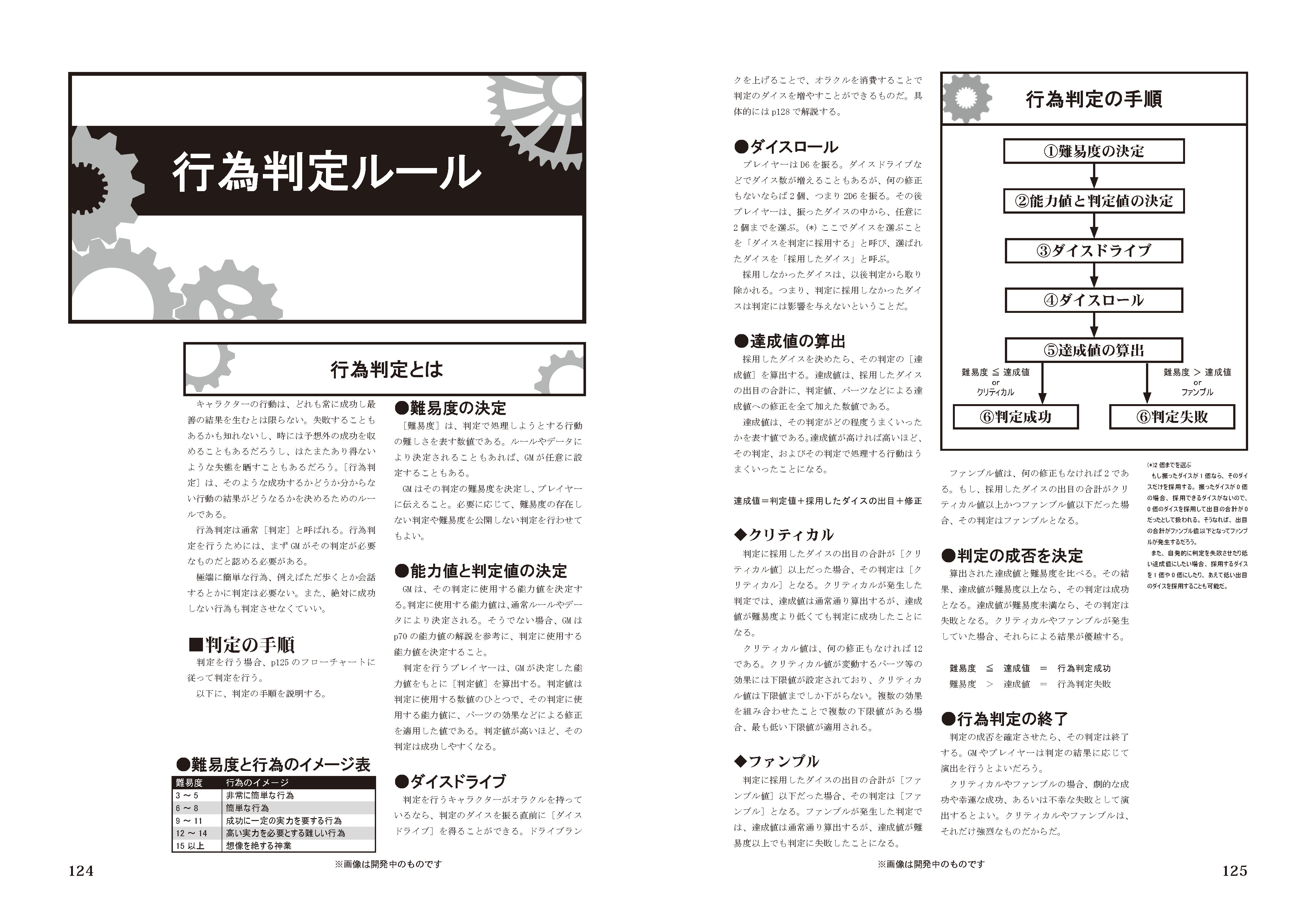 ▼公式サイトはこちらhttps://oracleengine.tumblr.com/ Fumctoryです。▼ルールブックチラ見せ「DTP一目見るだけでも作品の精度が分かる」ということなので、ルールブックの中から当たり障りのなさそうなページとして、判定ルールのところを2ページだけ公開します。ルールブックは、だいたいこんな感じのクオリティのDTPが200ページ少し超えるくらい続きます。「本当にルールブックできてるのか?」「持ち逃げするんじゃないか?」といった不安を払しょくするのにご利用ください。