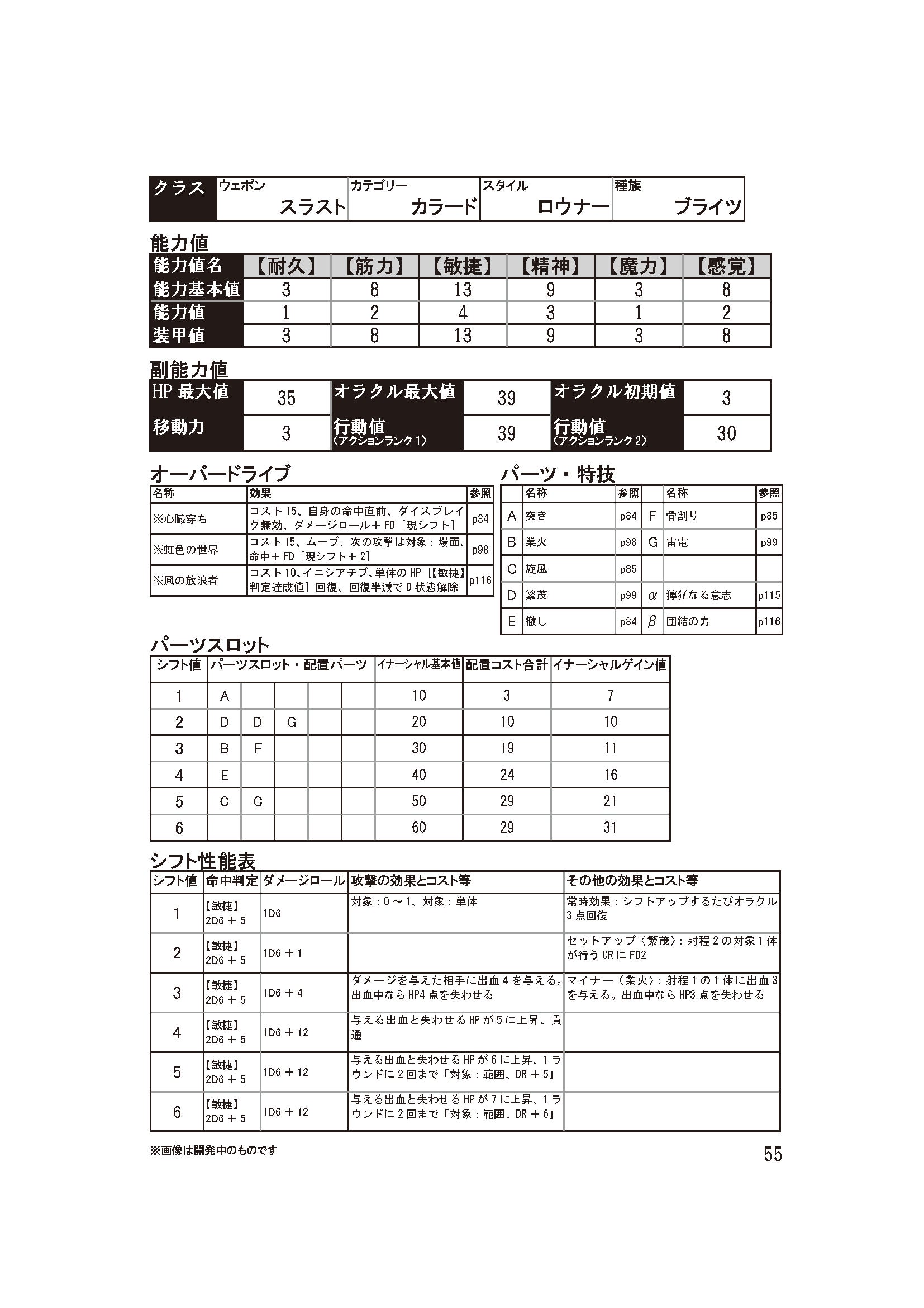 ▼公式サイトはこちらhttps://oracleengine.tumblr.com/ 続いて3番目のサンプルキャラクターは、これまでと大きく変わって搦め手タイプです。▼鮮血薔薇の棘このサンプルキャラクターのオラクルウェポンは、刺突で攻撃する「スラスト」と、6色の属性の魔力を利用する「カラード」を組み合わせたものです。行動値39はサンプルキャラクター中2位の素早さ。先手を取ることが重要なオラクルウェポンの性能を、十分に引き出してくれます。オラクルウェポンの特徴としては、「出血」というバッドステータスがあります。出血を受けているキャラクターは、判定を行うたびに出血の値と同じだけHPを失ってしまいます。攻撃のために命中判定をしても、攻撃に対処しようと防御判定をしても、体を動かせばそれだけでHPを失ってしまうのです。先手を取って堕落獣に出血を与え、後続の味方が追撃をかけるだけで、ものすごい勢いでHPが減っていきます。シフトが高ければ高いほど、出血で失わせるHPの量は多くなるので、できるだけ高いシフトで先手を取りたいところです。また、シフト2以上なら、近くの味方のクラッチロールを支援し、ダイスを2個増やすこともできます。元々1D6のクラッチロールが3D6になることは、高いシフトを目指すほどに頼もしさを感じるでしょう。もちろん、相手がオラクルを使えば、もっと多くのダイスでクラッチロールができます。ダメージロールのダイス量はシフトに関わらず1D6ですが、ダメージロールだけでない戦い方ができる、独特なオラクルウェポンです。種族は一般的な人型種族である「ブライツ」、スタイルは孤立した状態でも戦い抜く生き様を表す「ロウナー」となっています。