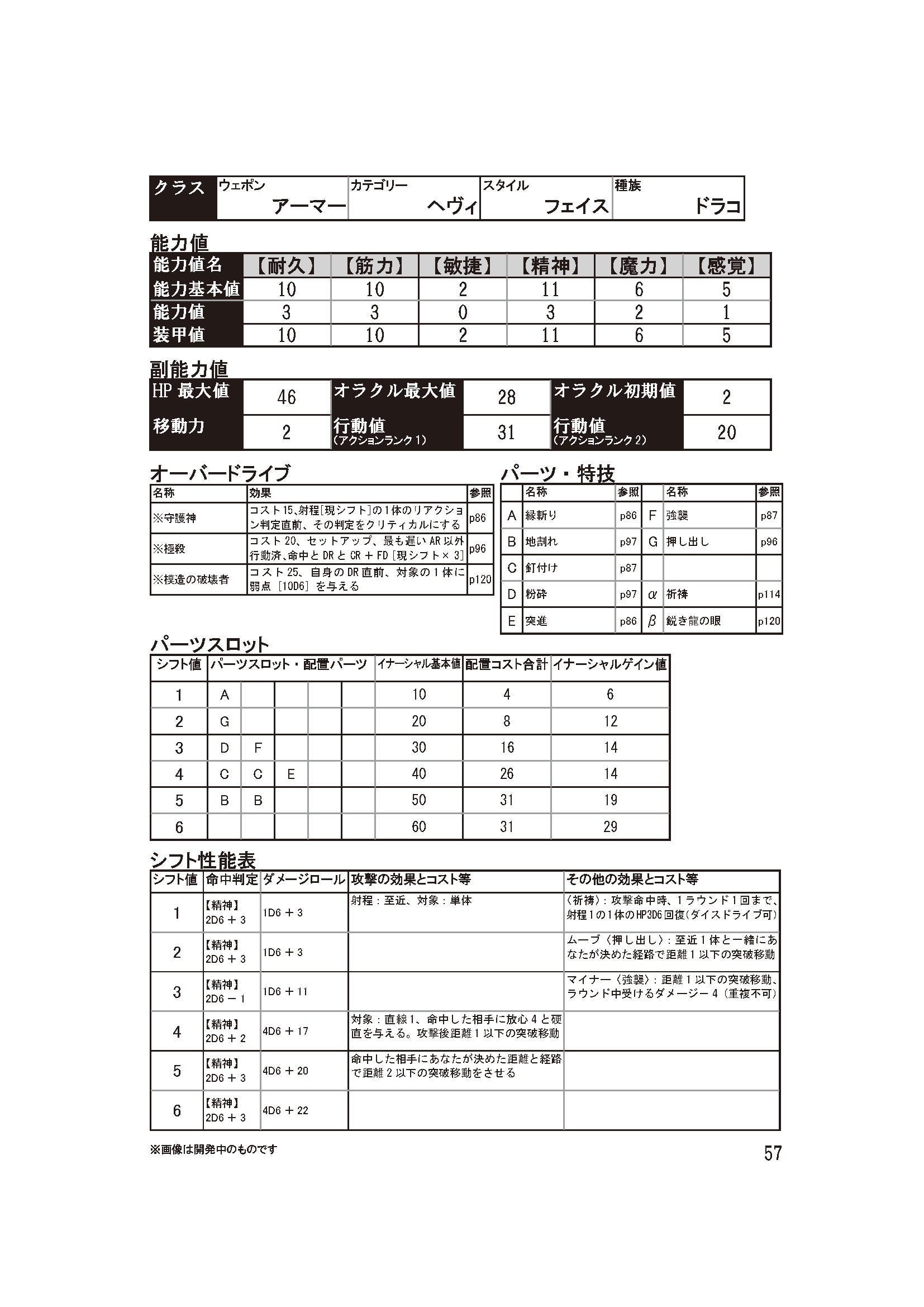 ▼公式サイトはこちらhttps://oracleengine.tumblr.com/ サンプルキャラクター4番目は、ちょっと武器っぽくない武器、大楯使いです。▼信じる心の護り手このサンプルキャラクターのオラクルウェポンは、防御用の装甲を重視した武器である「アーマー」と、重量級・大型の「ヘヴィ」を組み合わせたものです。そこそこの行動値を持っているため、味方に出遅れて足並みが揃わない、ということは避けられるでしょう。オラクルウェポンの特徴は、装甲値や防御判定などの直接的防御性能ではなく、「相手を押し出して自分と一緒に強制移動させる」「攻撃が当たった相手を移動不能にする」「攻撃が当たった相手を吹き飛ばして移動させる」といった、移動を主軸として戦局をコントロールする能力にあります。味方と一緒に移動して前線への到着を後押ししたり、至近距離にしか攻撃できない敵を跳ね飛ばして攻撃を封じ込めたりといった動きで、戦略に影響を与えながら戦うことができます。移動関連の性能に加えて、シフト4以上なら攻撃のダメージもそこそこ高いものになっています。コンスタントにダメージを出しながら、敵をコントロールしていけるでしょう。堕落獣は個体ごとに決められた一定の法則に従って、攻撃対象を選びます。その習性も利用できれば、味方への損害を最小限に食い止める鉄壁の盾となることができるでしょう。種族は、かつて神々が、破壊神を模して作った龍人の「ドラコ」、スタイルは信仰心や仲間との信頼を力に変える「フェイス」となっています。