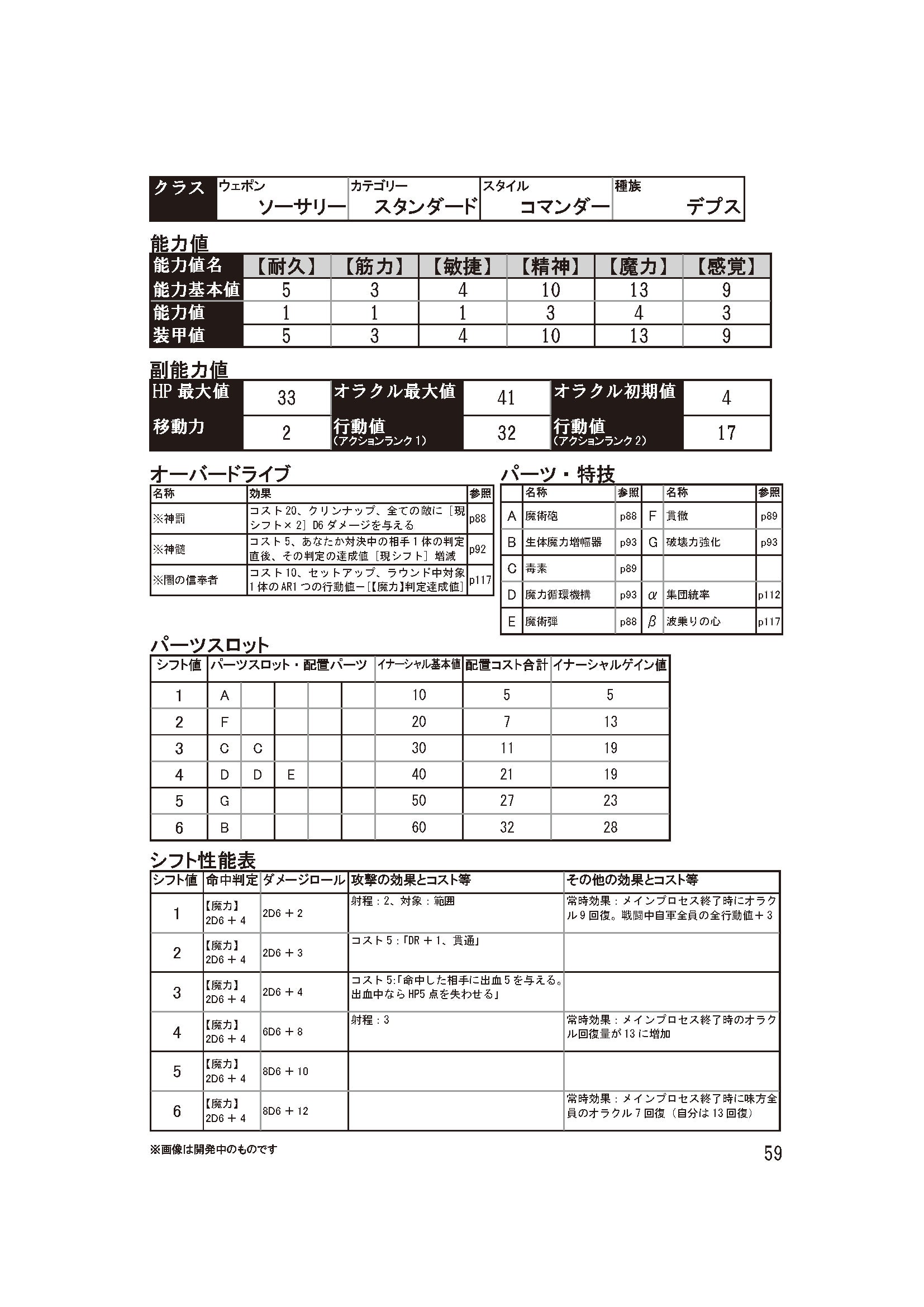 ▼公式サイトはこちらhttps://oracleengine.tumblr.com/ サンプルキャラクター5番目は、これまた武器っぽくない武器、魔術の使い手です。▼魔力を織るものこのサンプルキャラクターのオラクルウェポンは、魔術で攻撃する「ソーサリー」と、標準的な性能の「スタンダード」を組み合わせたものです。スタンダードと言いつつ、無個性どころか強烈な個性を持っています。行動値は標準的な値と低めの値のふたつ。やや遅めの行動値を持つことが、このキャラクターにとっては大いに意味を持ちます。オラクルウェポンの特徴は、何と言っても「メインプロセス終了時、自分のオラクルが回復する」ことです。この効果はシフト値がいくつであっても発揮されます。たとえ攻撃の命中判定にオラクルを6点使ったとしても、メインプロセスが終われば9点オラクルが回復します。シフトが4以上なら、回復量は13。もはやオラクルを尽きさせるのが困難なほどでしょう。その上、シフト6に到達すれば、味方PC全員のオラクルまで回復するようになります。このオラクル回復という支援は、他のオラクルウェポンでは中々実現できません。攻撃そのものも、射程のある範囲攻撃でダメージもそこそこあるため、ただのオラクル回復装置になることもありません。尽きることのないオラクルを駆使し、自ら積極的に攻めていくこともできます。種族は水中に適合した「デプス」、スタイルは仲間を導く指揮官の戦い方を表す「コマンダー」となっています。