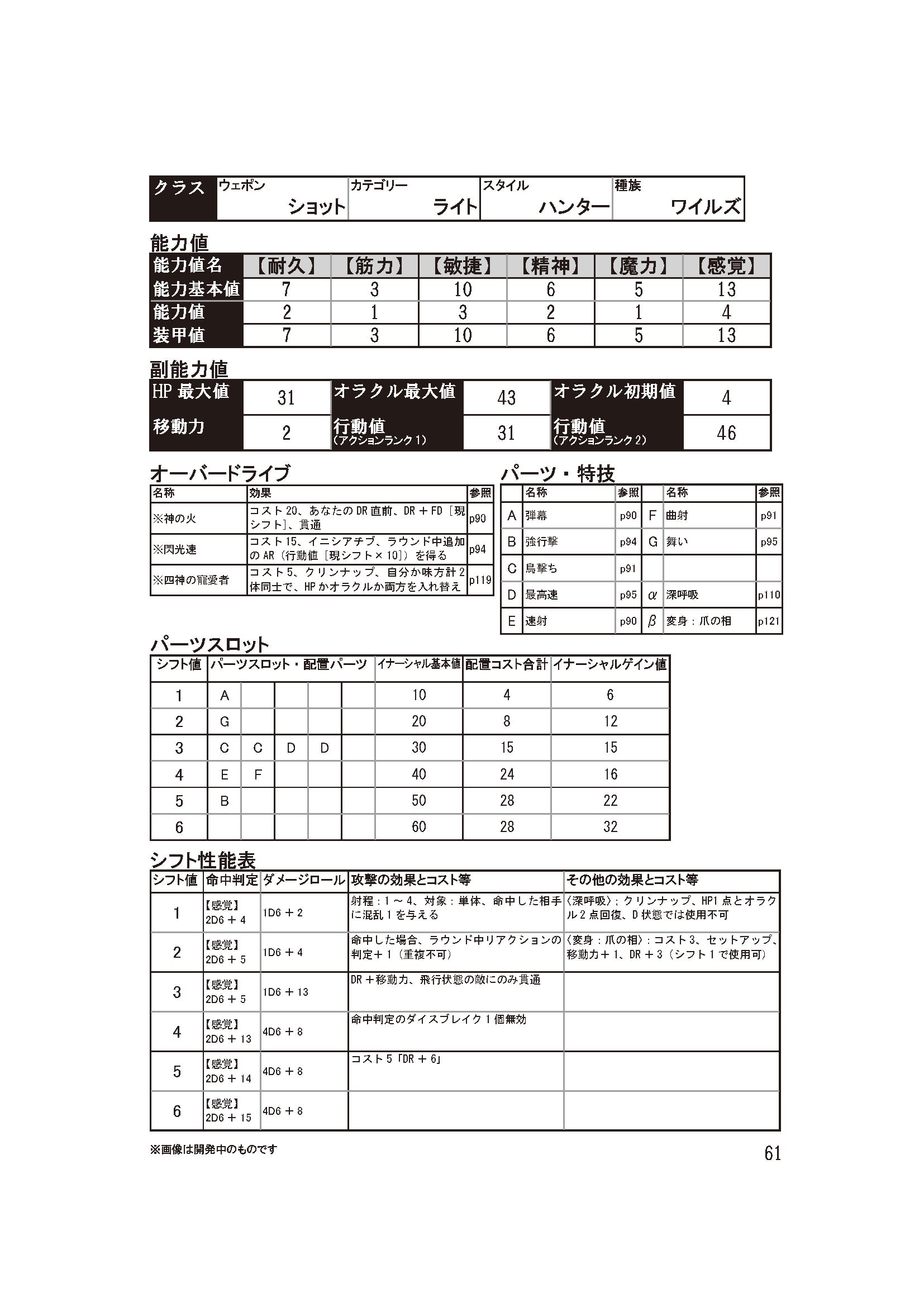 ▼公式サイトはこちらhttps://oracleengine.tumblr.com/ サンプルキャラクター6番目、最後は武器らしい武器に戻って射撃武器です。▼軽やかなる魔弾このサンプルキャラクターのオラクルウェポンは、射撃で攻撃する「ショット」と、軽量級・小型の「ライト」を組み合わせたものです。行動値はサンプルキャラクター中最速の46。大半の堕落獣に対して先手を取ることができます。オラクルウェポンの特徴は、その射程の長さにあります。1~4という射程はサンプルキャラクター中最長ですが、懐まで入ってきた敵には攻撃できないというデメリットも併せ持ちます。シフトを上げるだけでなく、自分の立ち位置、堕落獣の攻撃や移動の習性まで見切った戦術眼が問われることになります。至近距離に攻撃できないリスクはあるものの、射程、命中精度、ダメージすべてが高水準でまとまっており、攻撃の命中判定のダイスを減らす「混乱」のバッドステータスも与えられるため、先手を取って一撃叩き込む要員としては非常に優秀です。ただし、他のサンプルキャラクターに比べると突出した強みが射程にしかないため、そこをいかに活用できるかが、活躍の決め手となるでしょう。種族は獣に変身できる「ワイルズ」、スタイルはチャンスを辛抱強く待つ狩人の戦い方を表す「ハンター」となっています。