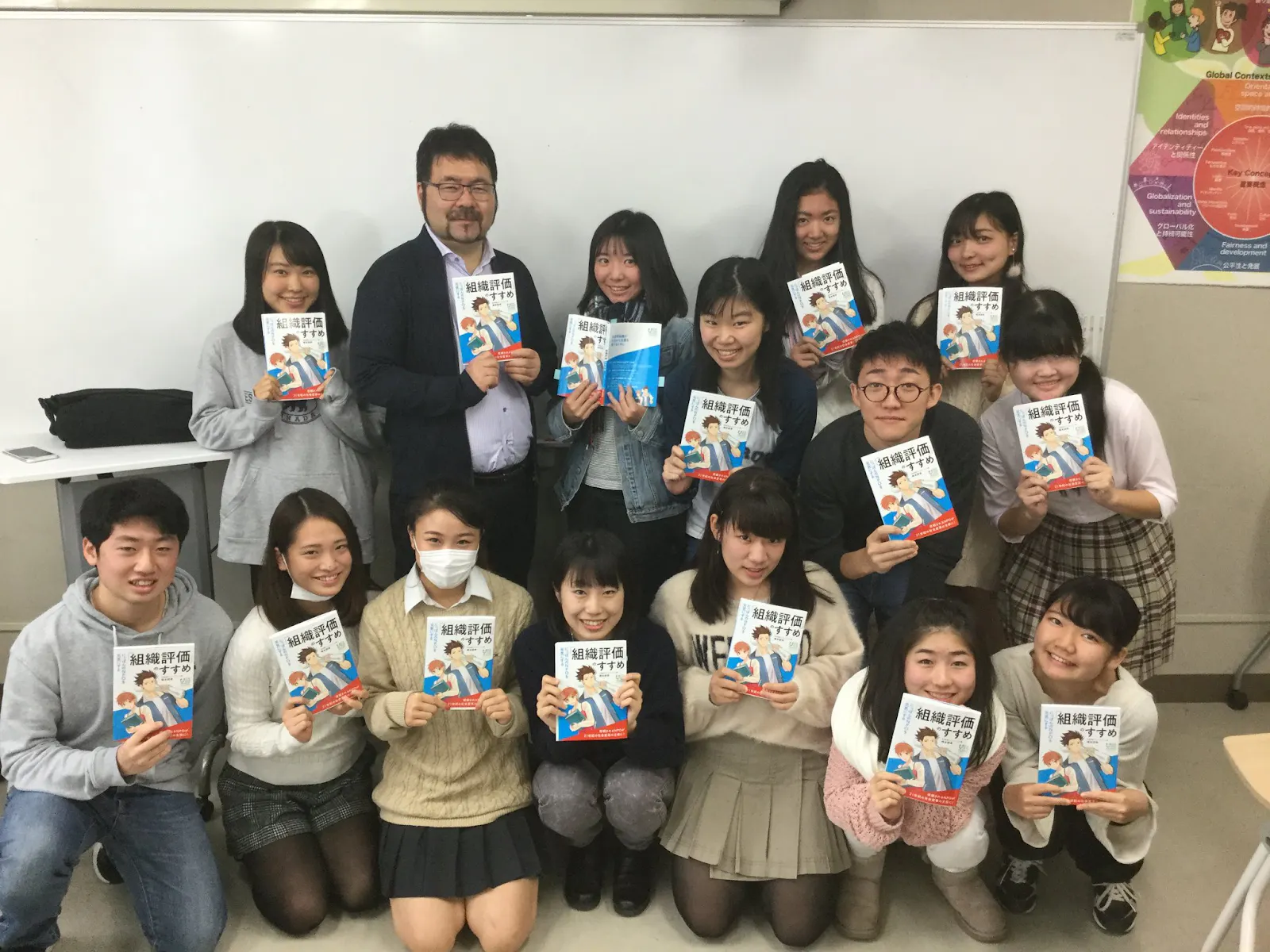 【ゲストスピーカーにお越しいただいて、NPO団体の評価基準に関する授業を受けた後の写真:『NPOの教科書』という書籍を用いた、生徒中心のNPOに関するリサーチから始まった私たちの学び。知識を増やせば増やすほど疑問が自分たちの中で生じ、調べてはまた新たな疑問にぶつかる。そんなことを繰り返していくうちに「NPOの教科書」に記述されていること以上の知識を自らの手で得ることができました。