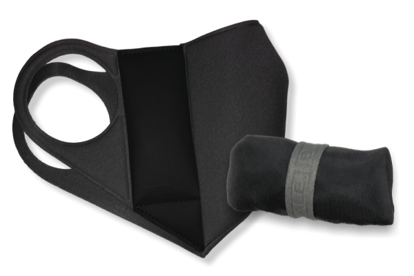 一体型のポシェットは、フェースラインをシャープに見せるよう袋状にデザインとしてマスクに縫い合わされています。マスクをたたんで、その異素材のポシェット部分に裏返すように収めます。ポシェットに収まったACTIVE MASKは、使用しない際に、マスクの内側(顔に触れる部分)が外部に触れることなく安全にポケットやカバンに入れておく事ができ、清潔に持ち運ぶことができ、マスク上に広げた際も折り目などなく、形状を記憶しています。