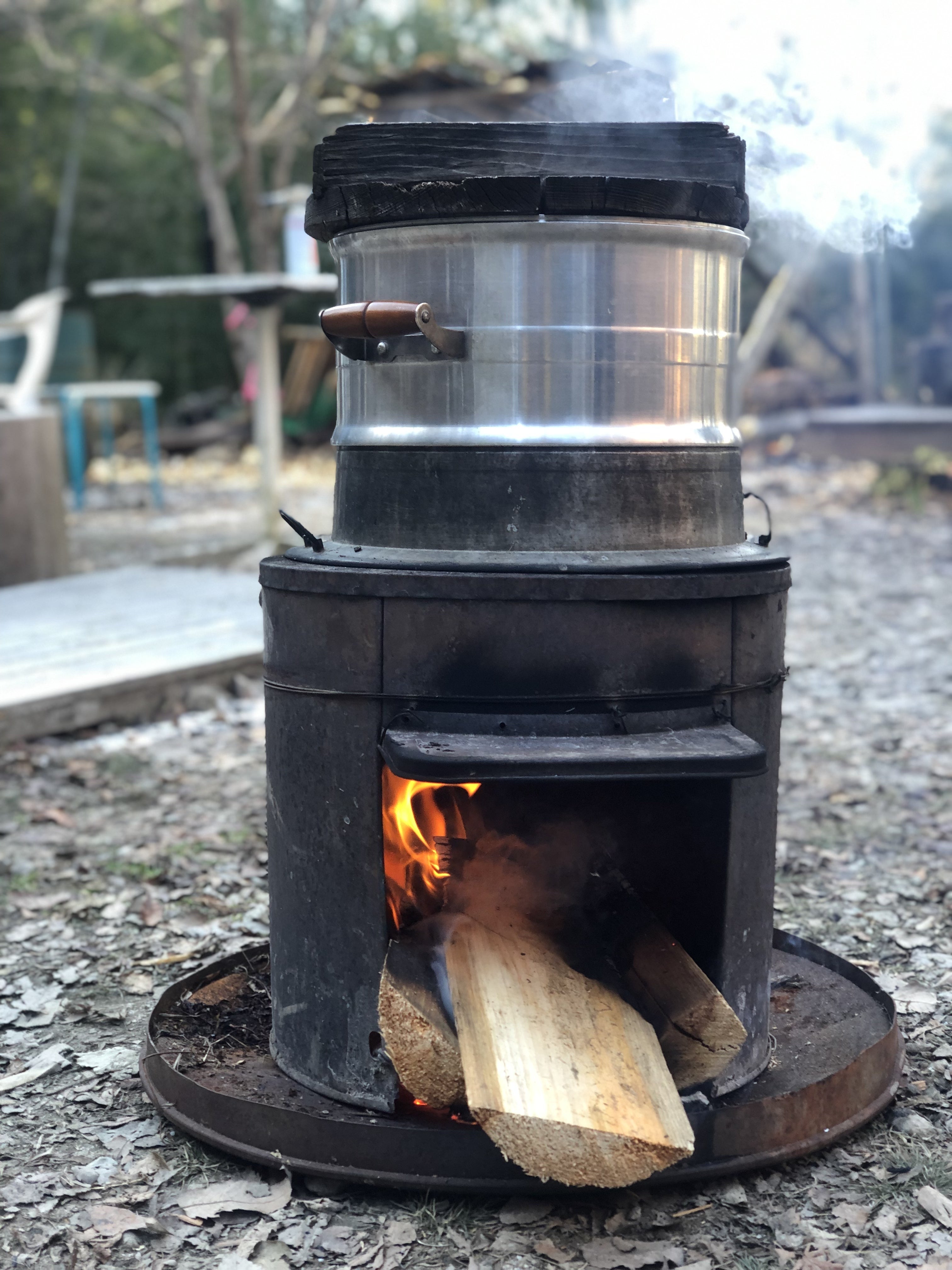 真っ青な空の下、焚火と音楽は最高の贅沢な時間です。