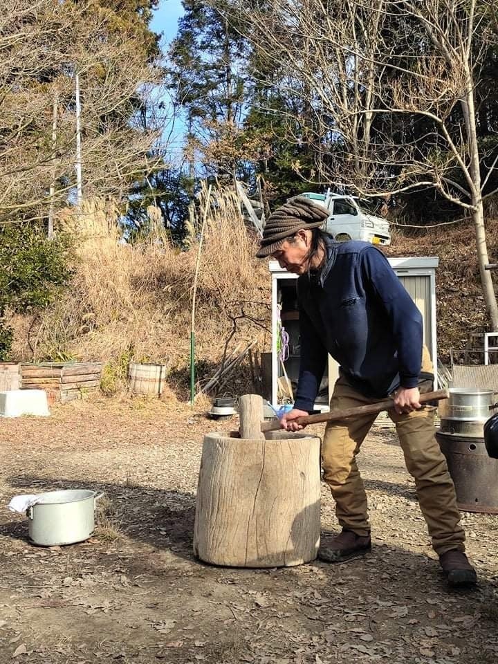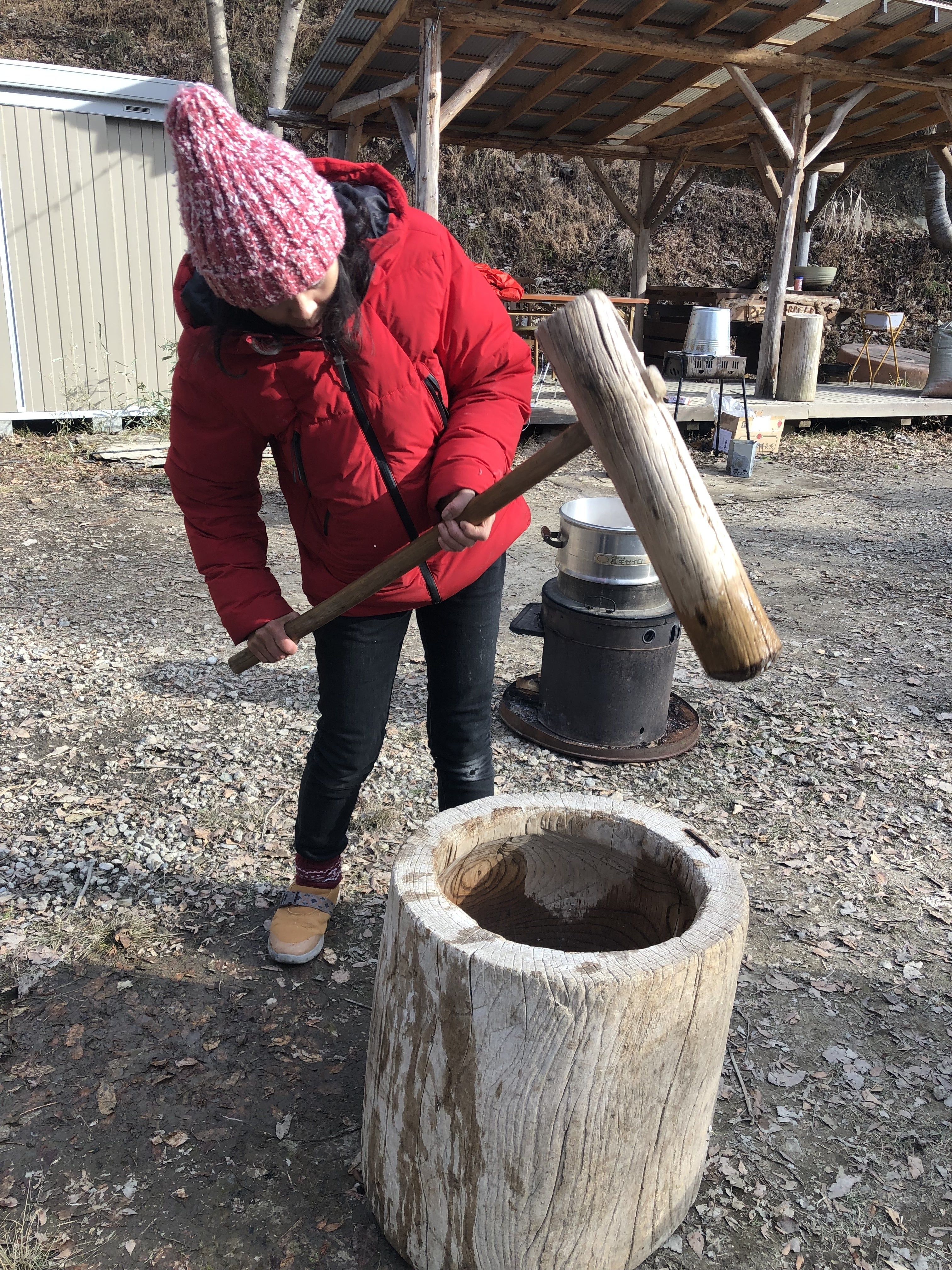 男でも重たい杵を持って、アキさんもお餅つきに初挑戦!