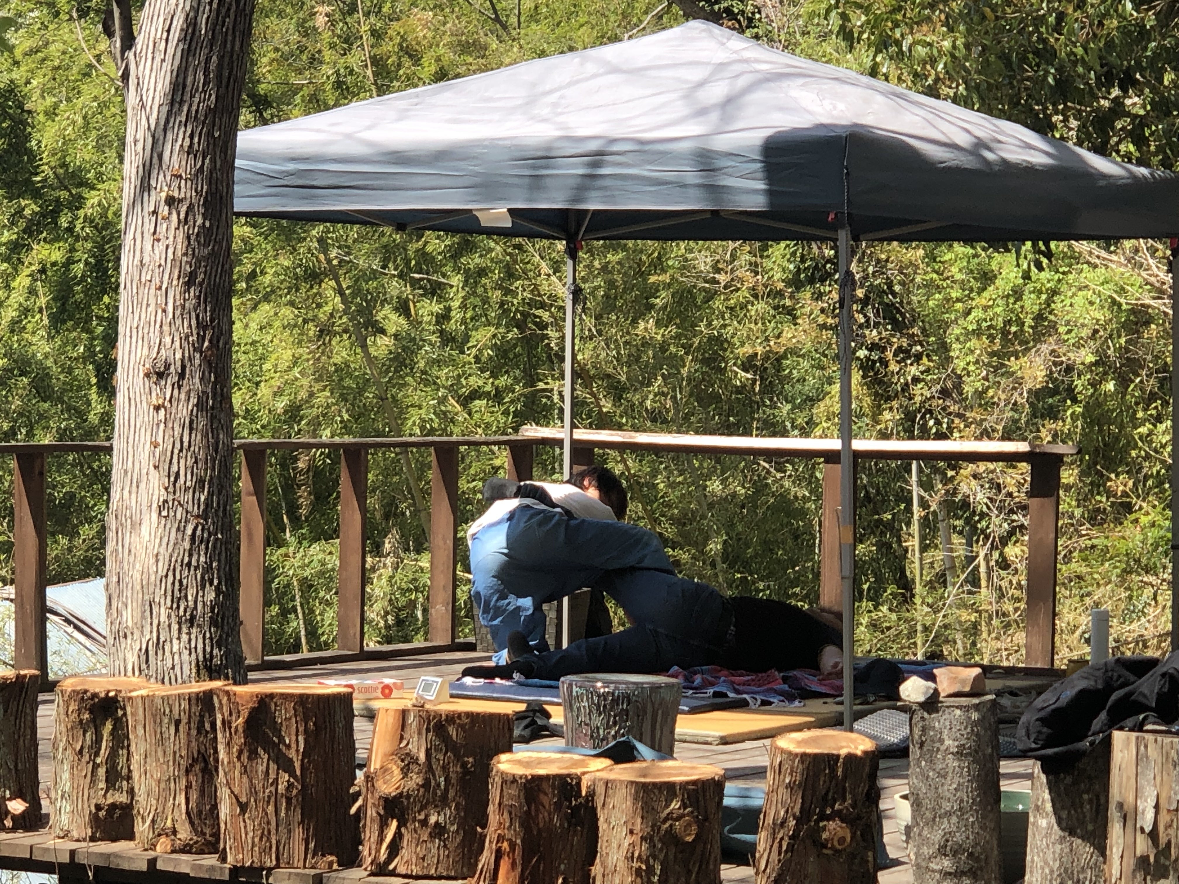 ウッドデッキでは投げ銭タイマッサージも大人気♪