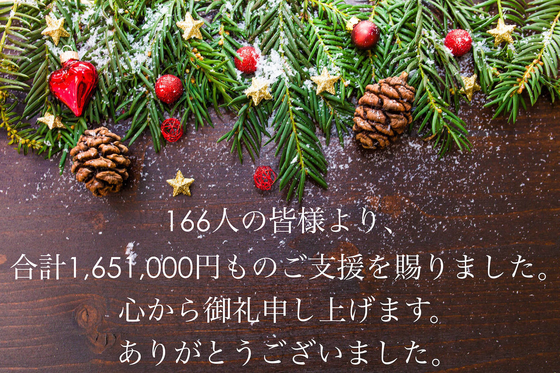 おかげさまで、昨日23:59をもちまして、私達のクラウドファンドプロジェクトの募集が終了しました。最終的に目標金額を大幅に上回る、1,651,000円のご支援をいただきました。無事に目標達成できましたのも、ひとえに皆様の多大なご支援のお陰です。心より御礼申し上げます。
