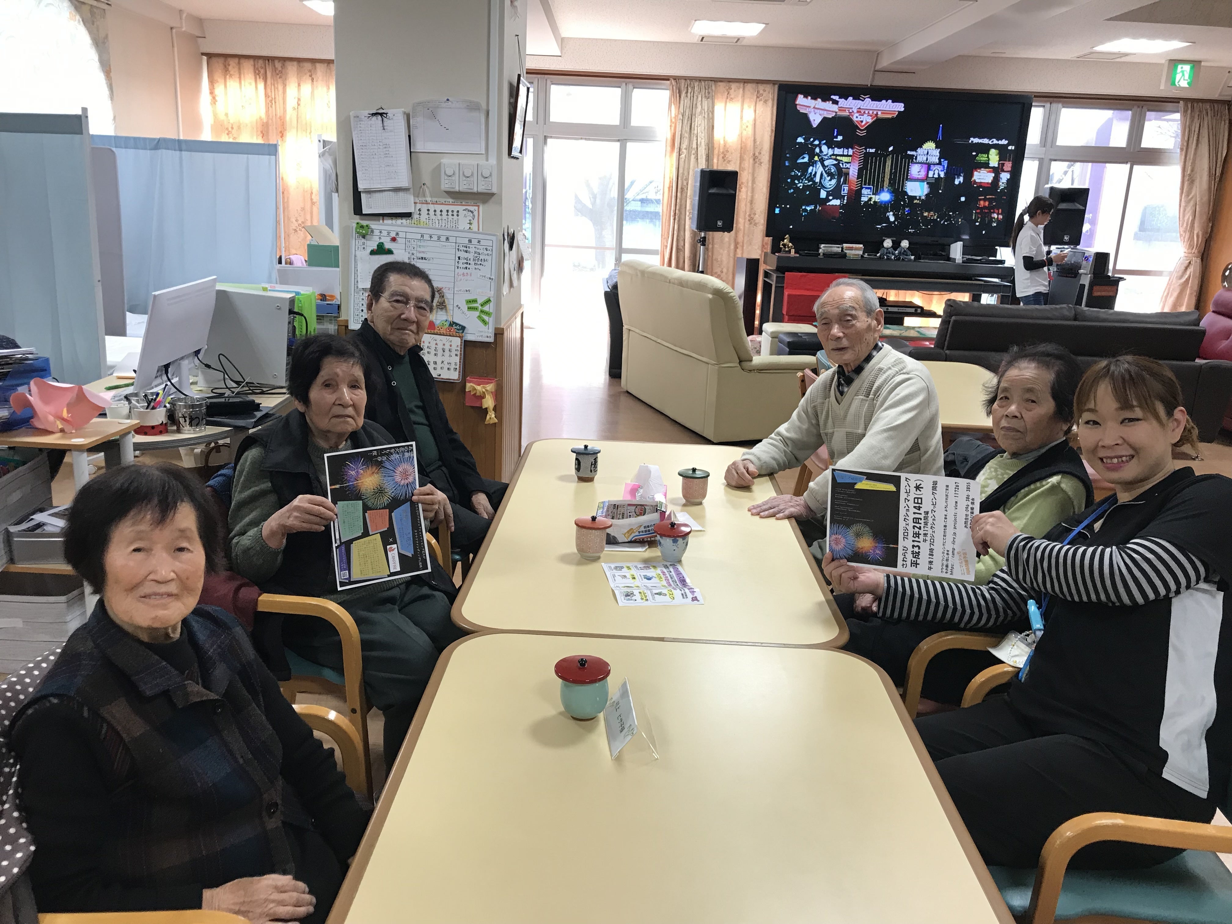 平成31年2月14日木曜日に無事にプロジェクションマッピング花火を開催できました事をここに報告致します。連日雨が降っていた為、開催ができるのか不安な毎日でしたが当日は雨も降らず、入居者様も元気に全員見る事ができました。協力してくださった皆様や地域の方々、入居者様のご家族以外に、お天道様にも感謝の気持ちでいっぱいになりました。私達の想いをみなさまが受け取って頂けたようです。全部で4回の放映をしたのですが、入居者様は入れ替わり立ち代わりでベランダに行ったり、居室の窓際にいったりとスタッフや家族と昔を懐かしみながら見ていただけました。今回このイベントを行った事で利用者様に「諦める事はない」という事をお伝えしたかったのですが、同時に私達介護職にとっても「諦める事はない」という思いに繋がりました。これから介護職という仕事に誇りを持ち、ご利用者様と共に人生を今回の花火のように彩りのあるものにしていきたいと思います。本当に有り難うございました。