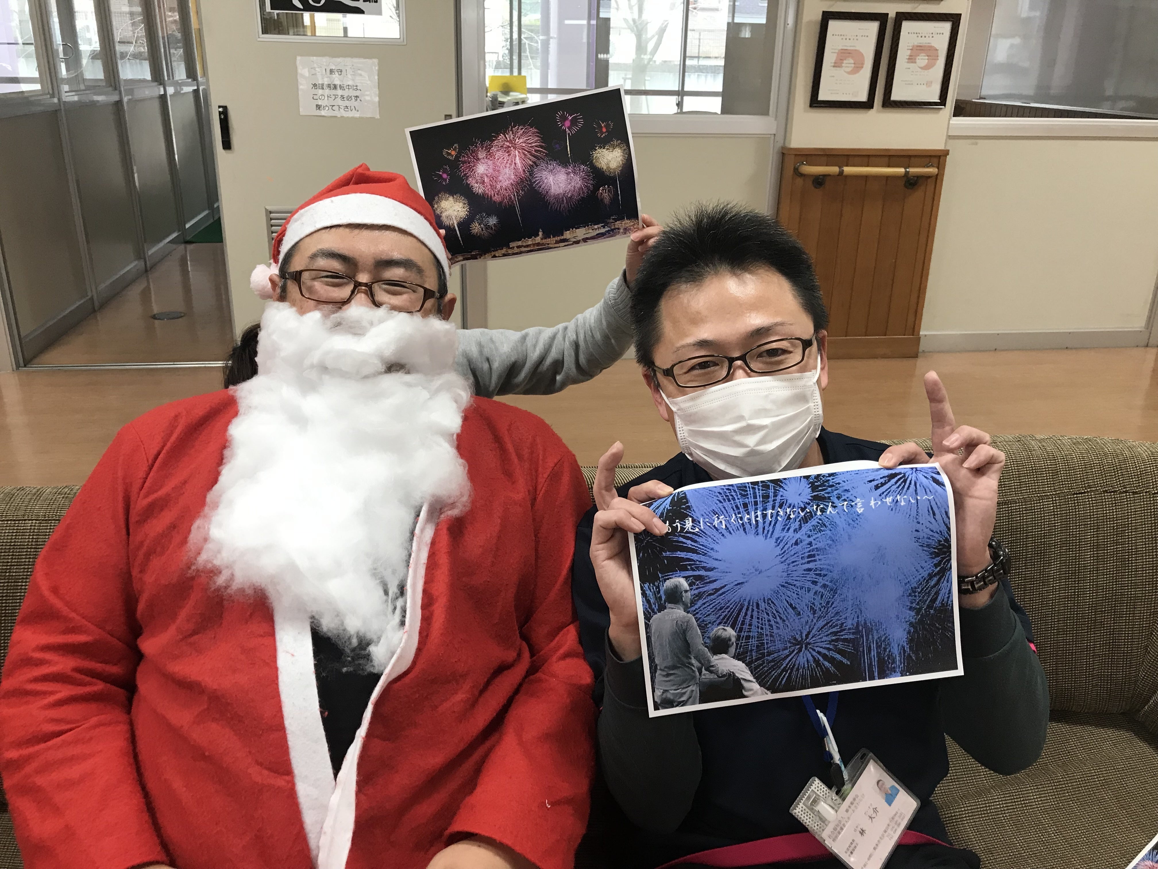 さわらびデイサービス 介護職の高岡 聡 & さわらび特養 相談員の林 大介です(先輩・後輩です)想い・・・人は、生きているといろいろな経験をして目で見て記憶に残っていると思います「行きたくてもいけない・・・・」とご利用者から声がありました。わたしたちは福祉職として、普段のケアもそうですが、それ以上に思い出に寄り添うことも大事であると考えます。そのため日本伝統行事の一つでもある花火大会を祭りに行く事なく、施設で提供できたら心の満足度を少しでも満たすことができるのはないか。今回このプロジェクションマッピングを実施して、ご利用者、そして地域の方に楽しんでもらえるような、そして記憶に残る、その後の会話につながるような花火大会にしたいと考えております。