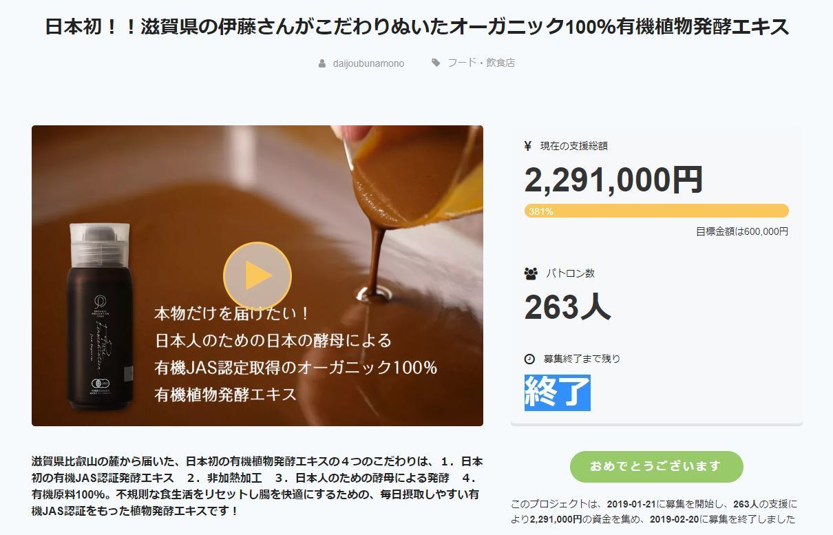 引き続き、疲れが取れずに苦しむ皆様に非加熱の生きた発酵エキスの存在を知って頂くべく、唯一の有機JAS認定の発酵エキスを作ってくれている滋賀県の伊藤さんを応援すべく、我々は、第二の目標(ストレッチゴール)として300%(180万円)を目指して頑張ります!