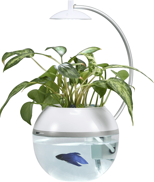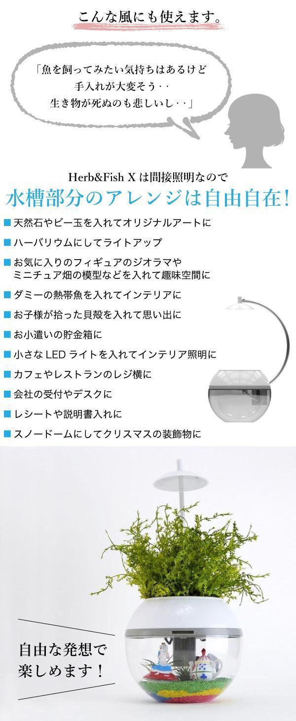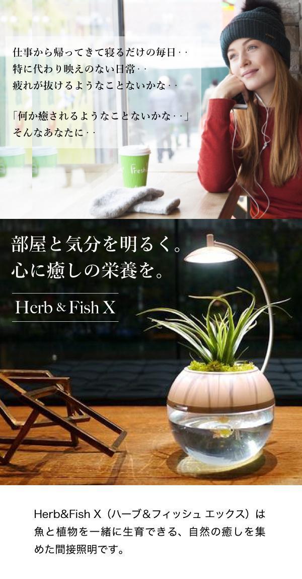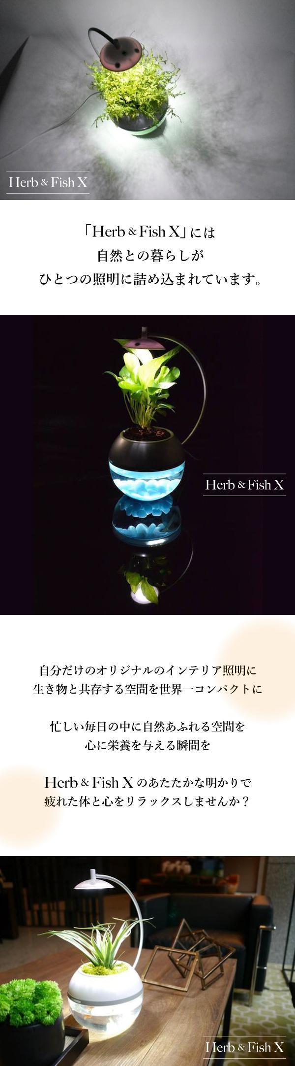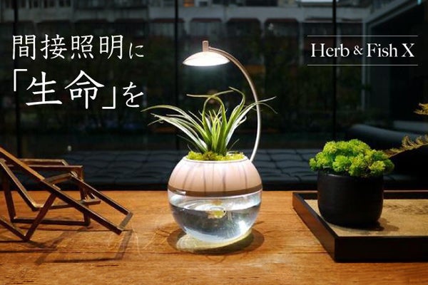 自宅の夜の空間を色鮮やかに彩る間接照明と植物&水槽がひとつになったのがHerb&Fish X。バジルやペパーミント、ポトスなど観葉植物の栽培とポンプを必要としないベタやメダカ、エビの飼育が同時にできます。