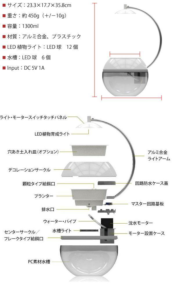 水槽部分には自動循環システムを搭載。ボタンワンタッチで水をポンプから吸い上げ、植物に自動で水を与えてくれます。水の量の調整も自動でしてくれるので根腐れの心配もありません(約6分間 <運転3分/停止3分>)。モーターの振動音などもなく夜寝る時もとても静かです。
