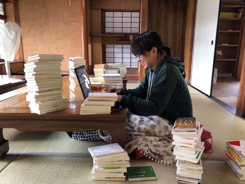 「鶴田真麻です。私は、津屋崎という町に、元々深い縁があったわけではありませんでした。偶然のご縁でライブラリーのお手伝いをさせてもらえることになったわけですが、なぜ、関わろうと思ったのか、理由があります。私は、とある本を読んでいて、"健全な負債感"という言葉、つまり"giveから始まる関係性や仕組みに対して、凄く良いなと思っていました。そんな時になまことかえるライブラリーの目指すところの一つに私が興味を持っていたものがあるのを聞いて、面白い、その先を見てみたいと思ったところから、スタッフとして関わるようになりました。 」(鶴田真麻さん)