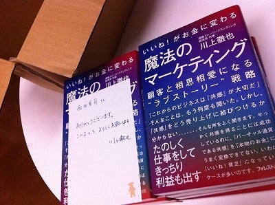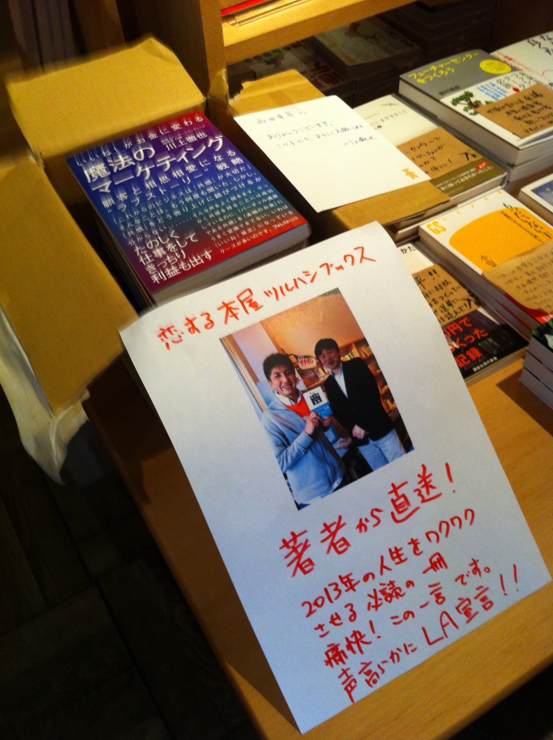 魔法のマーケティング(川上徹也 フォレスト出版)これを2012年の年末に読んで、衝撃を受け、すぐに著者の川上さんに連絡をとって、10冊直送してもらいました。それを1月5日に展開したのが上の写真です。