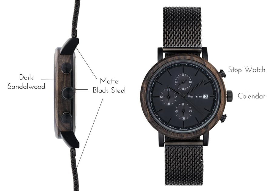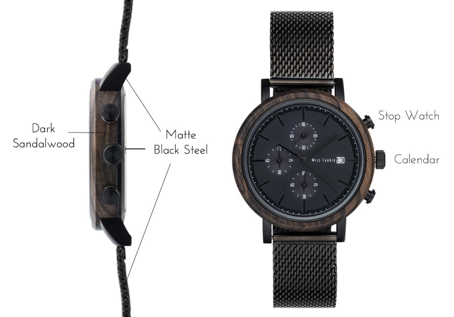 Designed made in Germany / サイズ - 43mm / 材料 - ブラックサンダルウッド & ステンレススチール / ベルト幅 - 20mm / ベルト材料 - メッシュバンド又は本革 / ムーブメント - Japan Seiko Chronograph Quartz