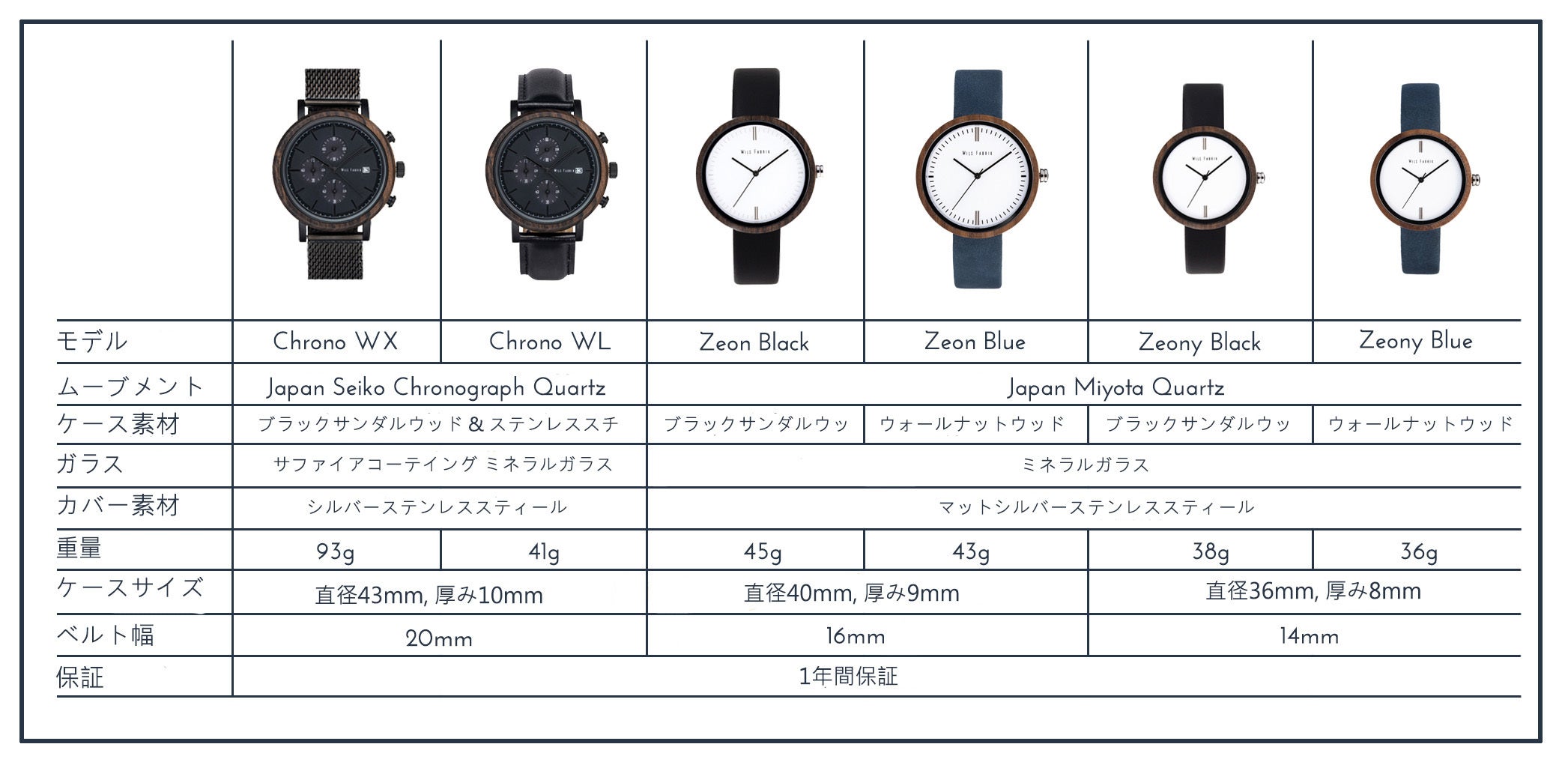 Designed made in Germany / サイズ - 40mm (Zeon); 36mm(Zeony) / 材料 -ブラックサンダルウッド OR ウォールナットウッド / ベルト幅 -16mm; 14mm / 重さ -40g; 36g / ムーブメント - Japan Miyota Quartz