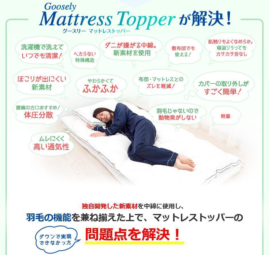 ふんわりとやさしく包み込んでくれる感触は一度使うと手放せなくなるマットレストッパーです。