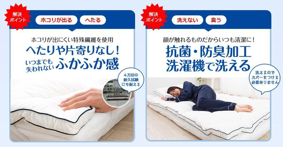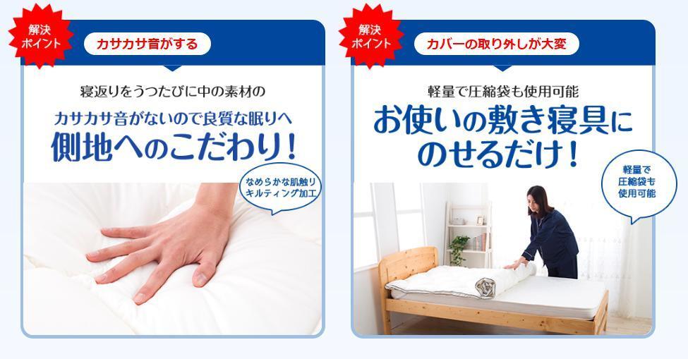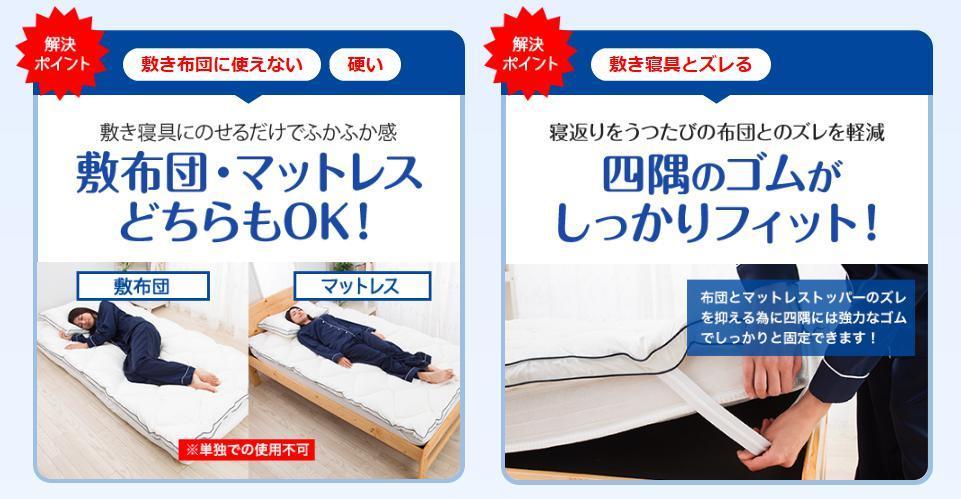 「今お使いのベッドマットレスや敷布団の上に敷くだけでホテルのような快適な寝心地へ」