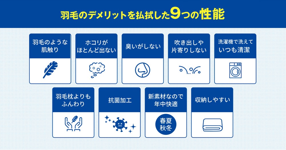 復元性検証と言われるわたのヘタリ度を検査する試験で4万回の圧縮テストを実施しましたが、羽毛やクッションわたと比較してほとんどヘタリが見られず耐久性にも優れていることが実証されました。