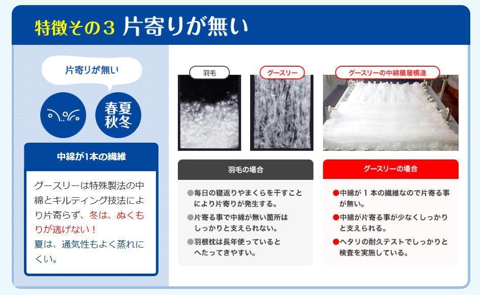 グースリーマットレストッパーの中綿に使われている特殊繊維は1本の長い繊維を使っているので通常のクッションなどに使われているわたと比べて片寄る心配はありません。