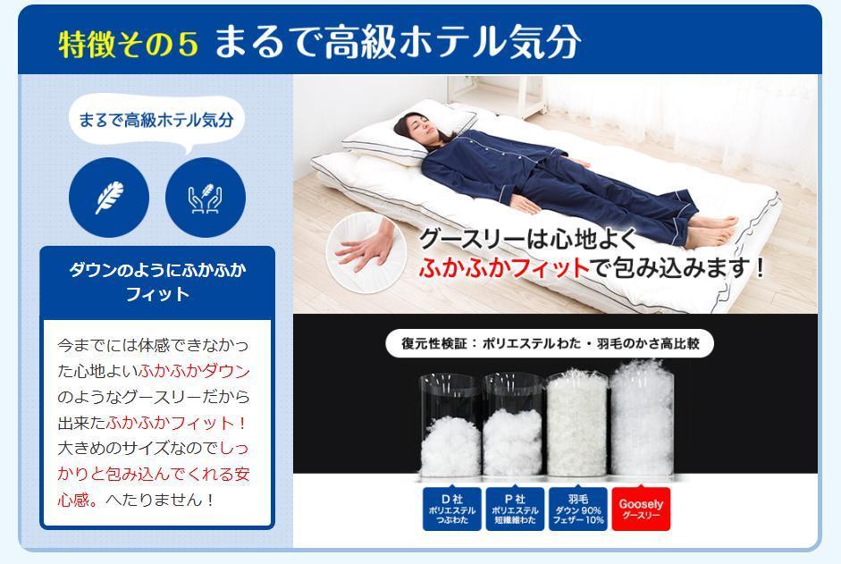高級ホテルで味わえるふかふかのベッドとふかふかの枕をモデルに作られたグースリーマットレストッパーは、今まで経験したことのないような新しい感触を実現しました。