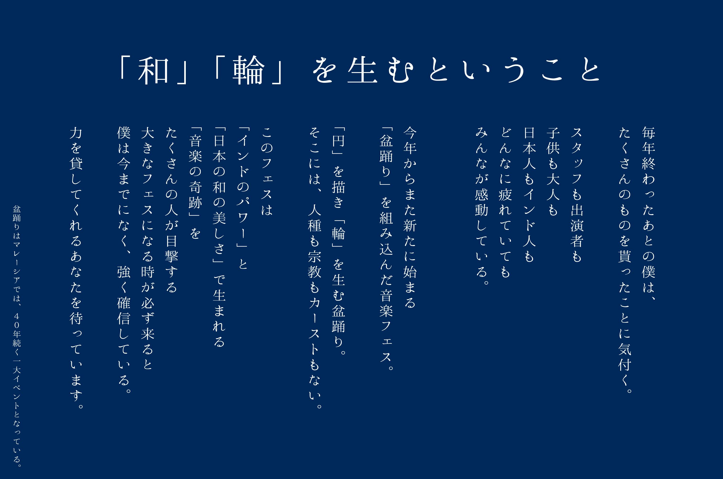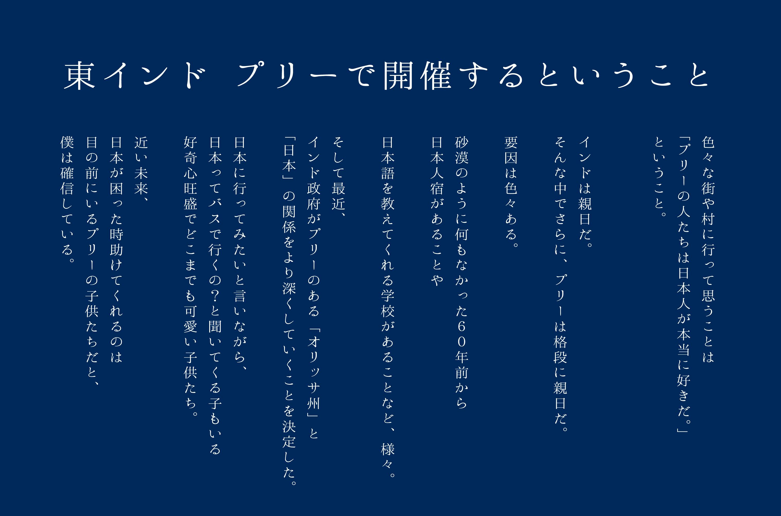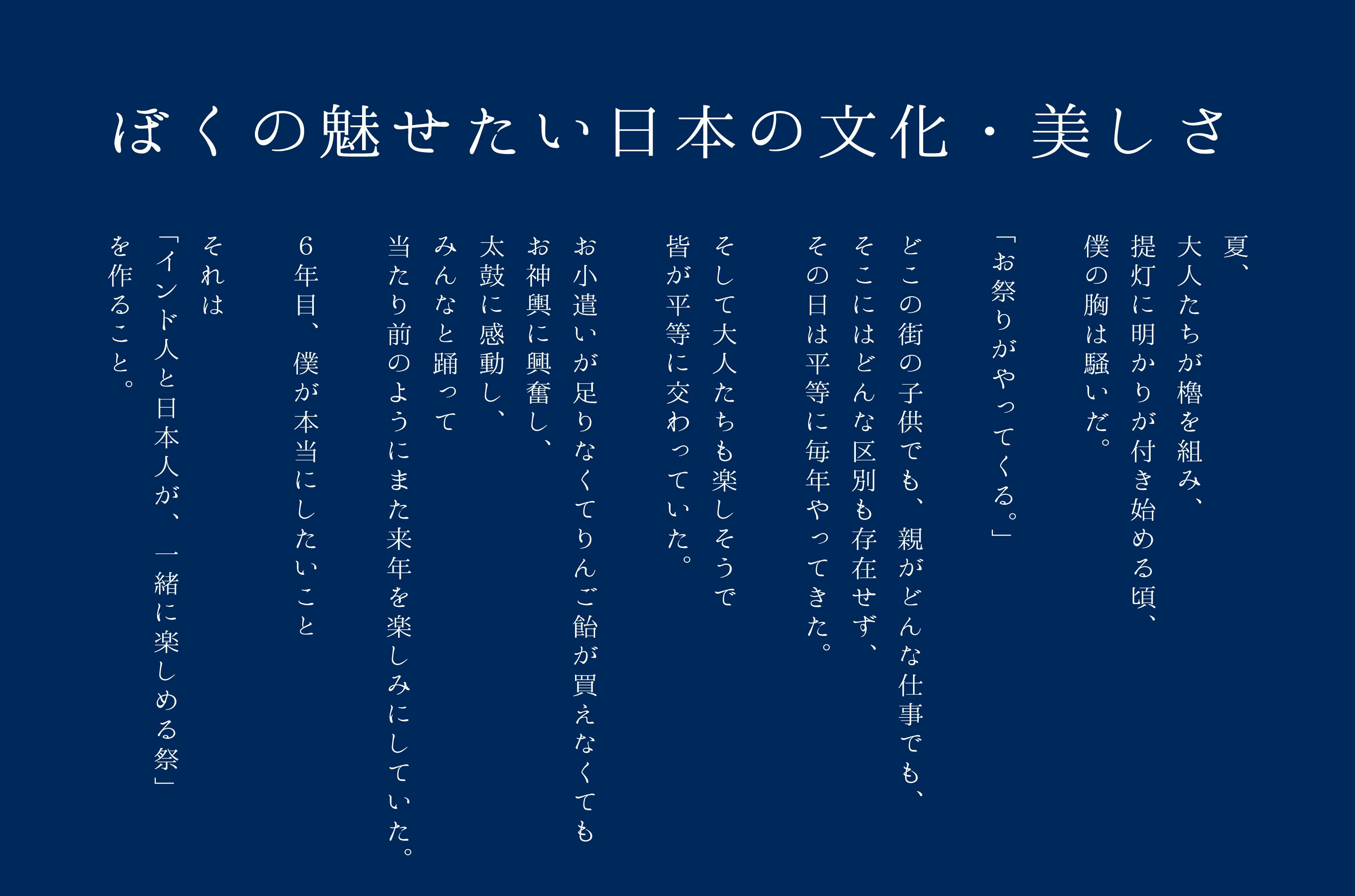 インド人と日本人が一緒に楽しめる祭りを通して、日本の文化・美しさ、何より子供の頃、僕たちが体験した、どんな人とも楽しめ合える「お祭りの喜び」を彼らと共有したい。そんな想いから今年もODISHA JAPAN FESTIVALを立ち上げました。
