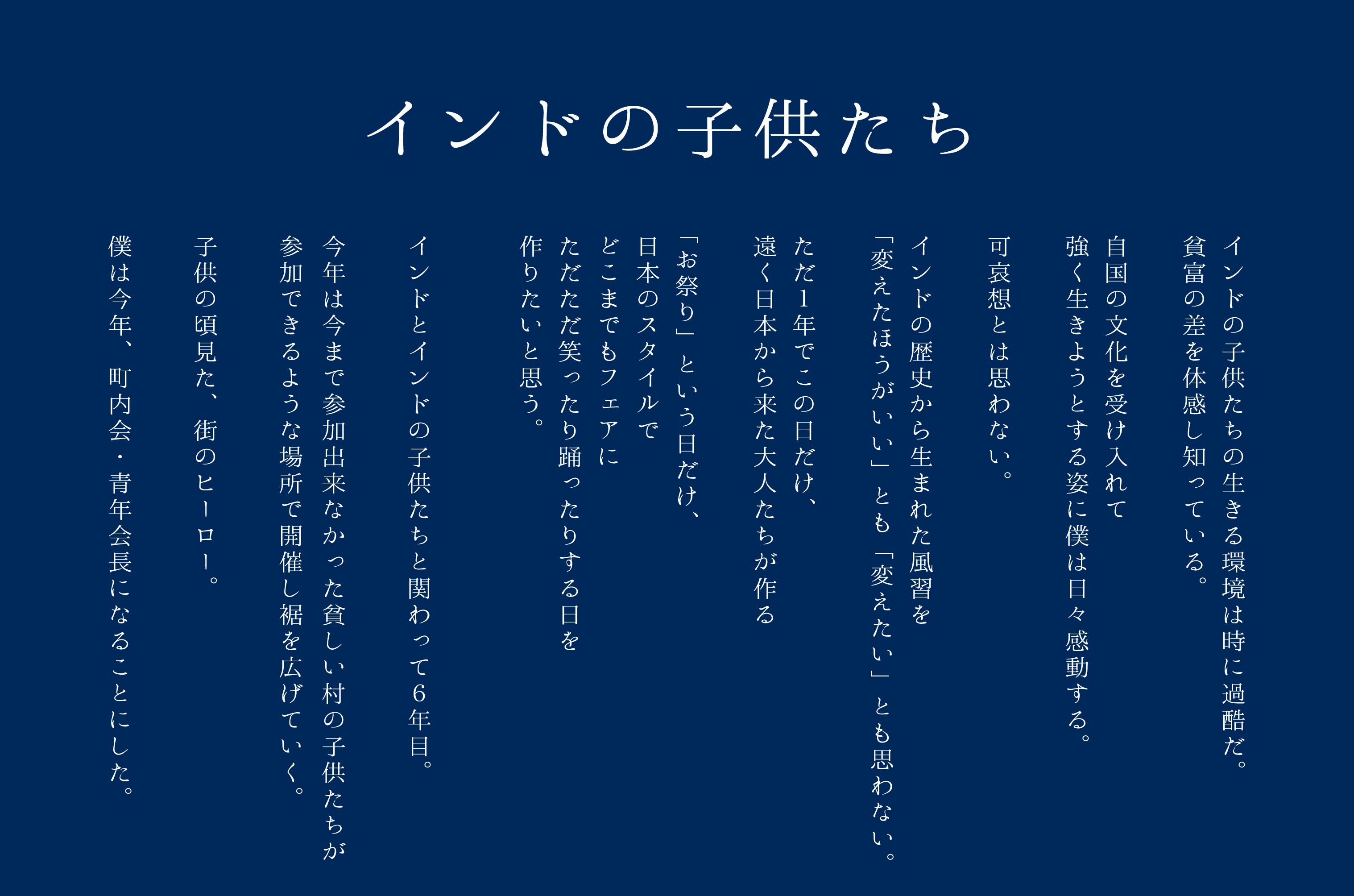 可哀想とは思いません。インドの歴史から生まれた風習を「変えたほうがいい」とも「変えたい」とも思いません。ただ1年でこの日だけ、遠く日本から来た大人たちが作る「お祭り」という日だけ、日本のスタイルで、どこまでもフェアに、ただただ笑ったり踊ったりする日を作りたいと思っています。