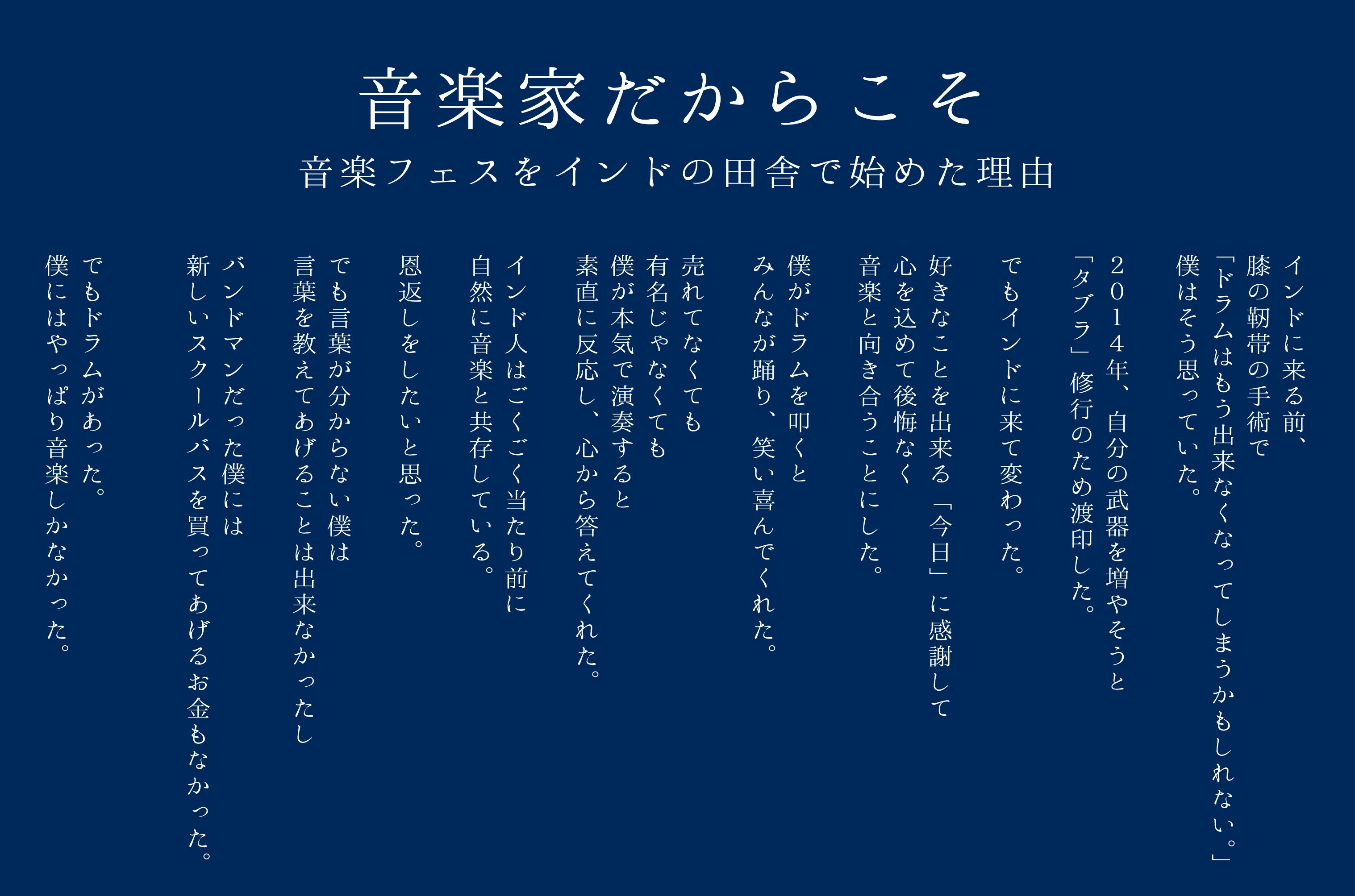 2014年にインドの打楽器「タブラ」修得のために渡印し毎年春に音楽フェスティバルを開催するようになりました。初めは15人だったお客さんも今では最大27.000人の観衆の前で演奏できたこともありました。
