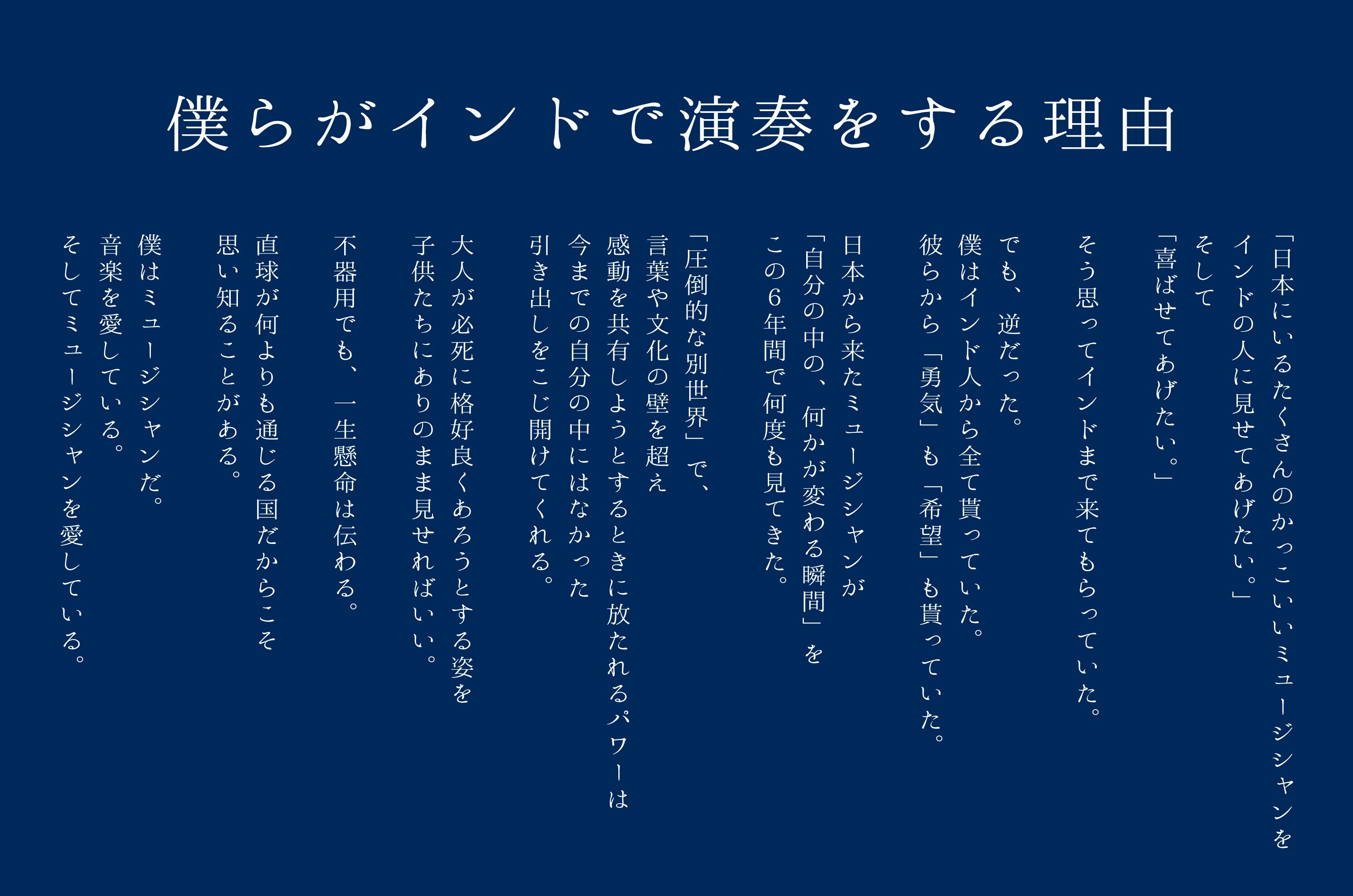 2019/03/20 13:45ODSIHA JAPAN FESTIVAL2019日中は燦々と太陽の光が降り注ぎ、夕方には息をのむような綺麗な夕日が街を包み、夜には人々が提灯のあかりを頼りに集まるほど綺麗な夜空で、最高なお祭り日和の中開催されました!-------------------------------------------------------------------------6年目の今、本当に作りたかったものそれは「インド人と日本人が一緒に楽しめる祭り」今回のテーマは「インドで盆踊り」。夏になると大人たちが櫓(やぐら)を組み、提灯にあかりをつけ、どこの町の子どもでも、親がどんな仕事でも、そこにはどんな区別も存在せず、その日は平等にやってきた。そして大人たちも楽しそうで、皆が平等に交わっていた。お小遣いが足りなくてりんご飴が買えなくてもお神輿に興奮し、太鼓に感動し、みんなと踊って当たり前のようにまた来年を楽しみにしていた。僕たちが体験した、どんな人とも楽しめ合える”お祭りの喜び”を共有したい。そんな思いで今年からまた新たに「盆踊り」を組み込んだ音楽フェスは2019年2月9日と10日インドオリッサ州プリー、ペンタコタにて大盛況の中幕を閉じました!また今年もミュージシャンをはじめ、多くの方々からご支援ご協力を頂きながら”本当に作りたかった素晴らしい空間”を確実に作ることが出来ました。何より一番嬉しかったのは、この町に住む、オリア語を話す子どもたち、漁師の村のテルグ語を話す子どもたちが一緒になって踊ったり笑ったり、楽しんでいる姿です。僕たちと同じように、櫓や提灯、こいのぼりなどに感動し、次々に繰り広げられるLIVEやダンスに盛り上がり、そこには大人も子どもも、国境も性別も言語も宗教も、なにもかもを超えた時間が流れていました。フェスの翌日から、町を歩くたびに多くの方々から「本当に楽しかった!」「もしかして昨日のフェスに出てた!?」「また来年もやってね!」「ありがとう!!」と笑顔と共に声をかけて頂いたり、握手や写真を求められたり、本当にやってよかったなと心から思えるフェスと成長できました。これも、温かい気持ちでこのフェスに関わってくださったすべての方々のおかげです。子どもたちにとって忘れらない出来事になったと信じて、これからも活動を続けて参りますので、引き続き何卒宜しくお願い致します!!フィルミレンゲ!(また明日!) もっと見る