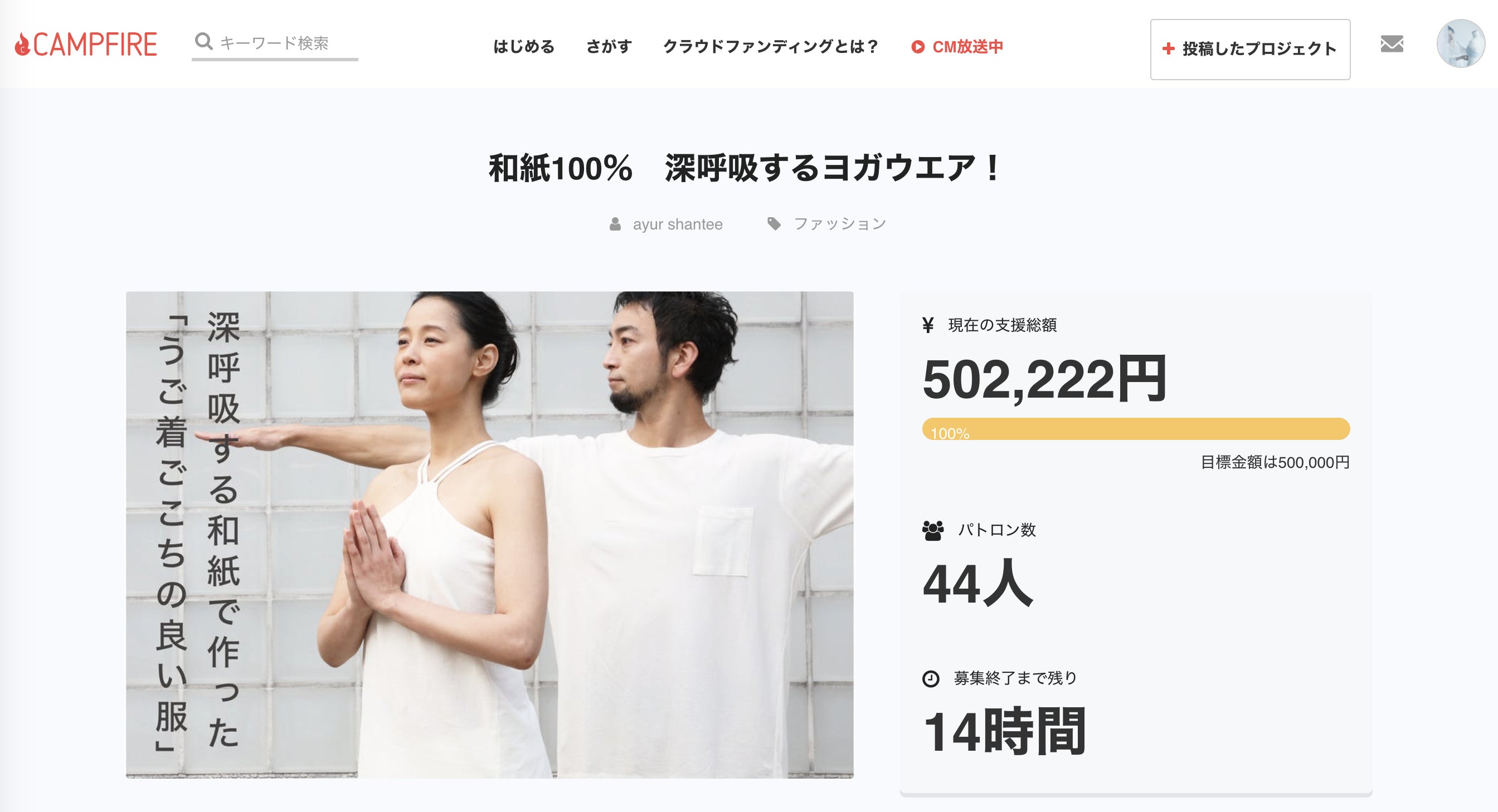 残り13時間も引き続きたくさんの方に和紙のヨガウエア の心地よさを知っていただけるよう頑張りたいと思います。