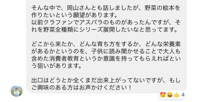 消費者が野菜について知っているからこそできる、野菜を選ぶより農家を選ぶ関係を作りたい。こどもが苦手な野菜を食べるきっかけをつくりたい。だからこそ、この絵本を作り、農家とお客さんのコミュニケーションを生みたいと思っています。
