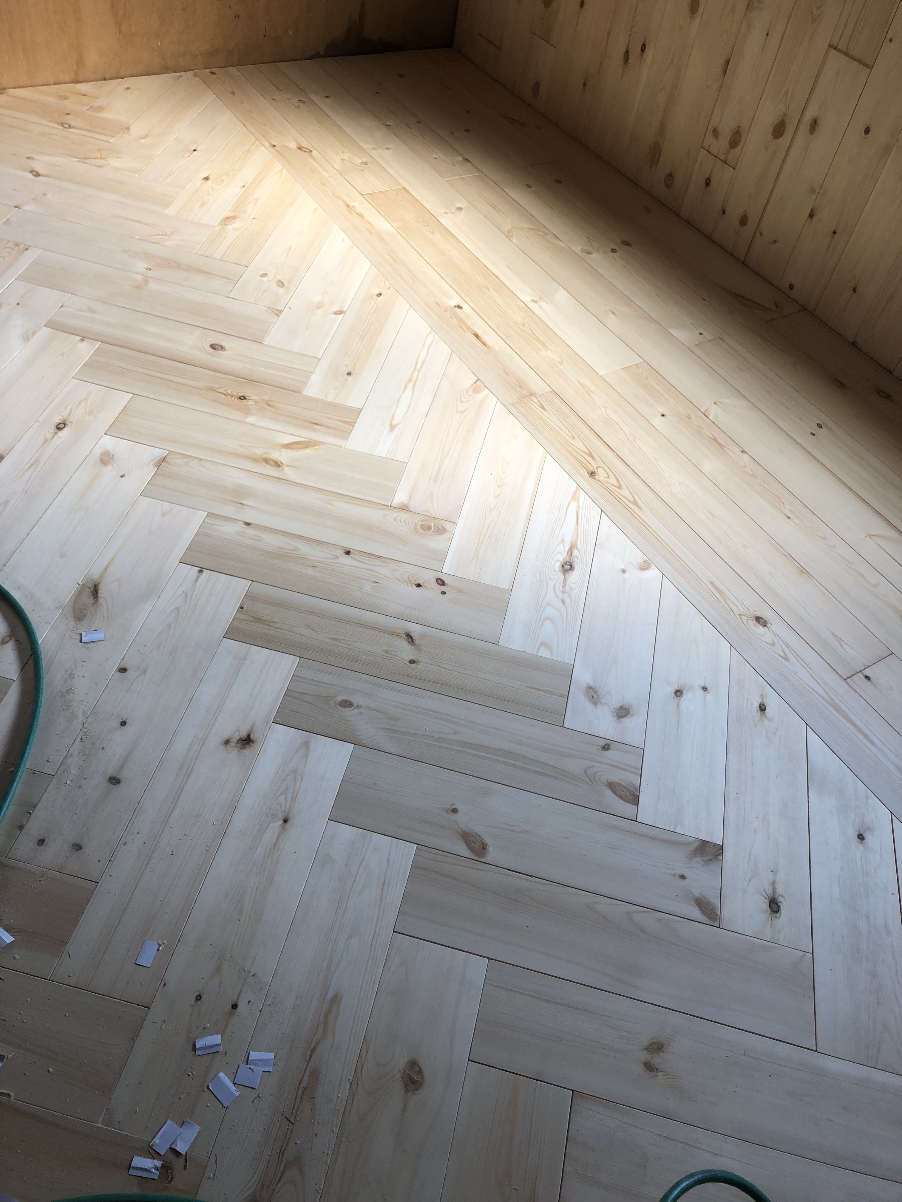 二階の板張りがいい感じで仕上がってきました。 匠の技でめんどくさいヘリンボーン貼りの床がすごく素敵です☆