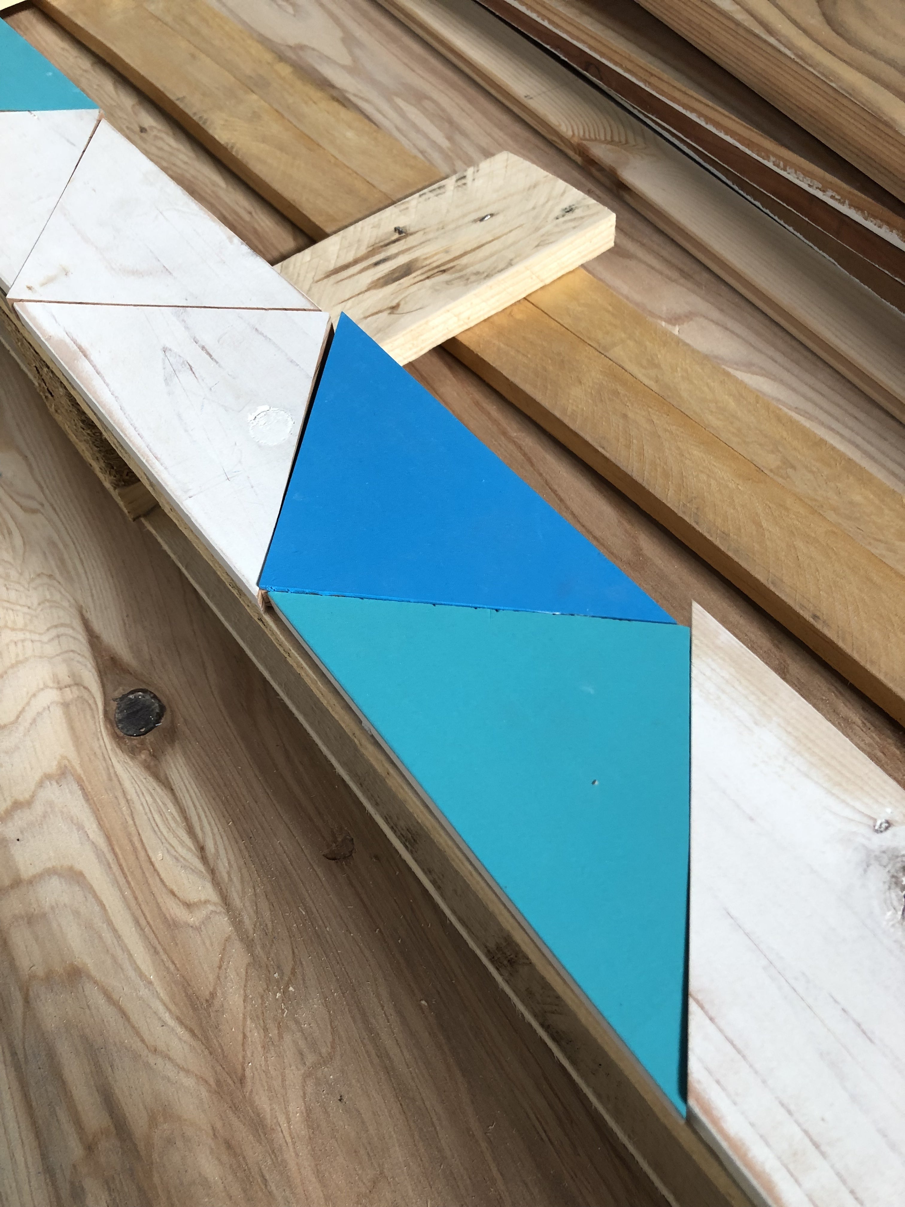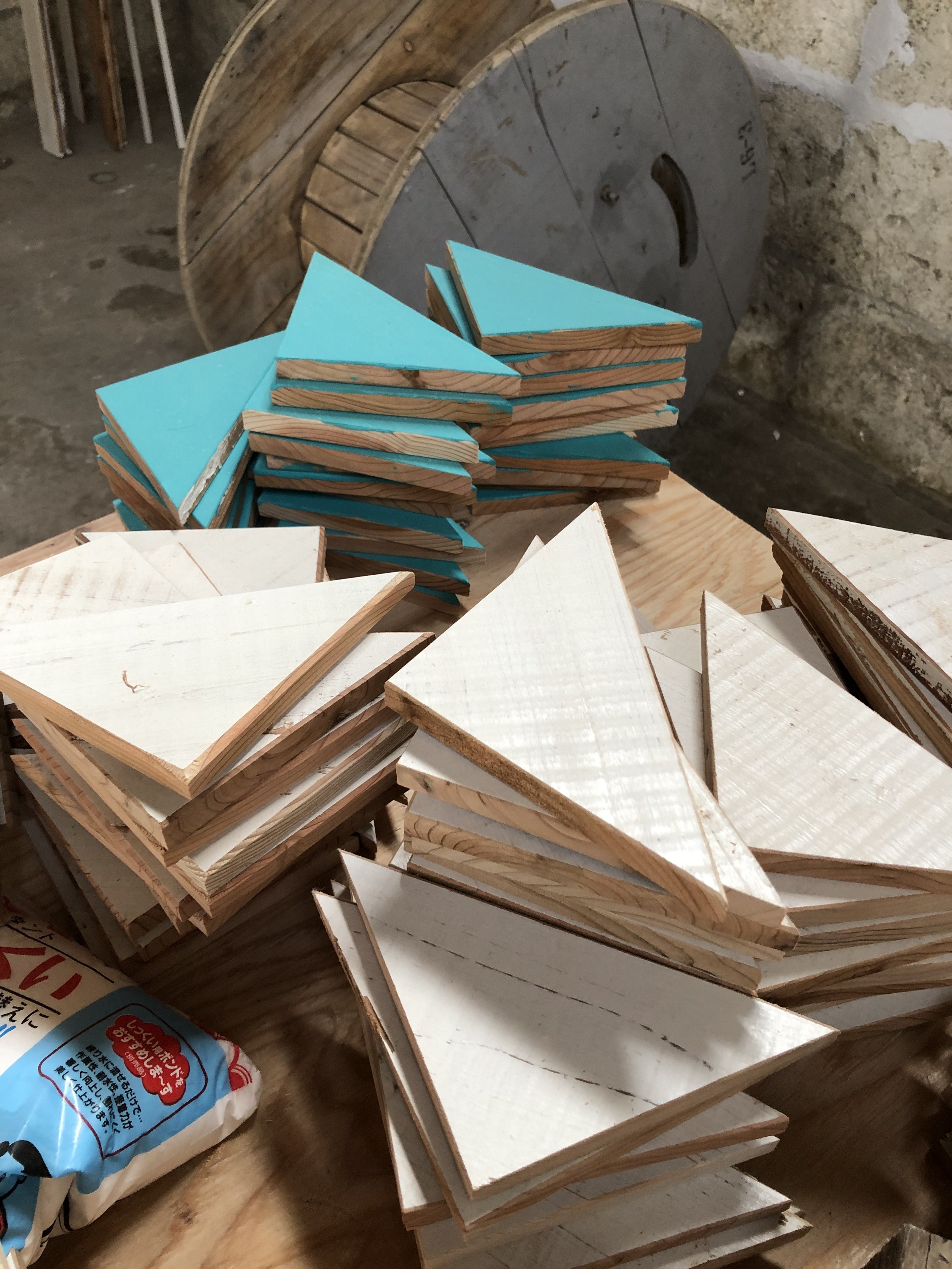 端材再利用で何かできなないかな? と、部材の切れ端に色を塗りました。 お店の内装は、「ヨーロッパの海辺」をイメージしてて、ブルーと白を基調にしたいなぁ。と思っています。