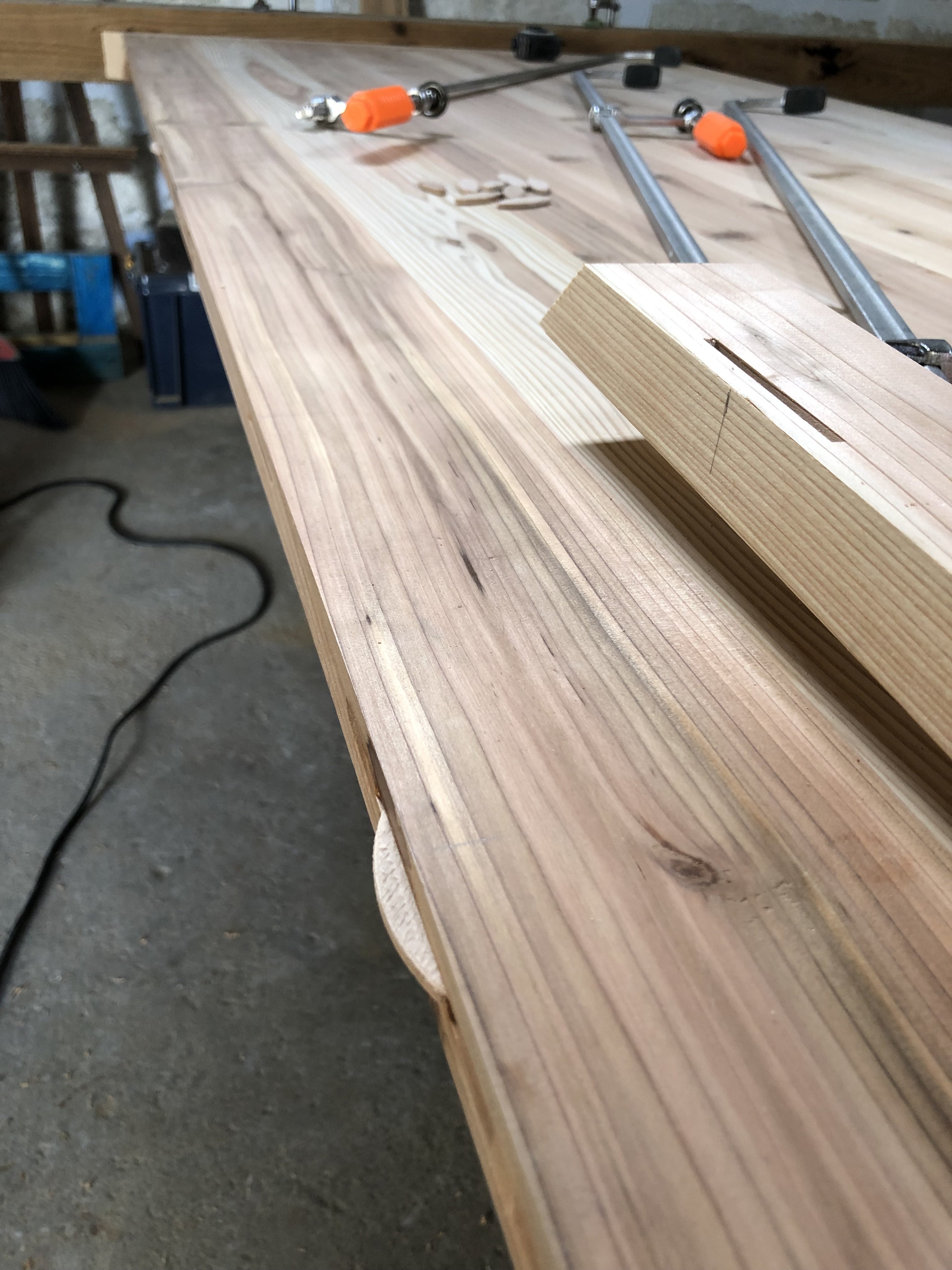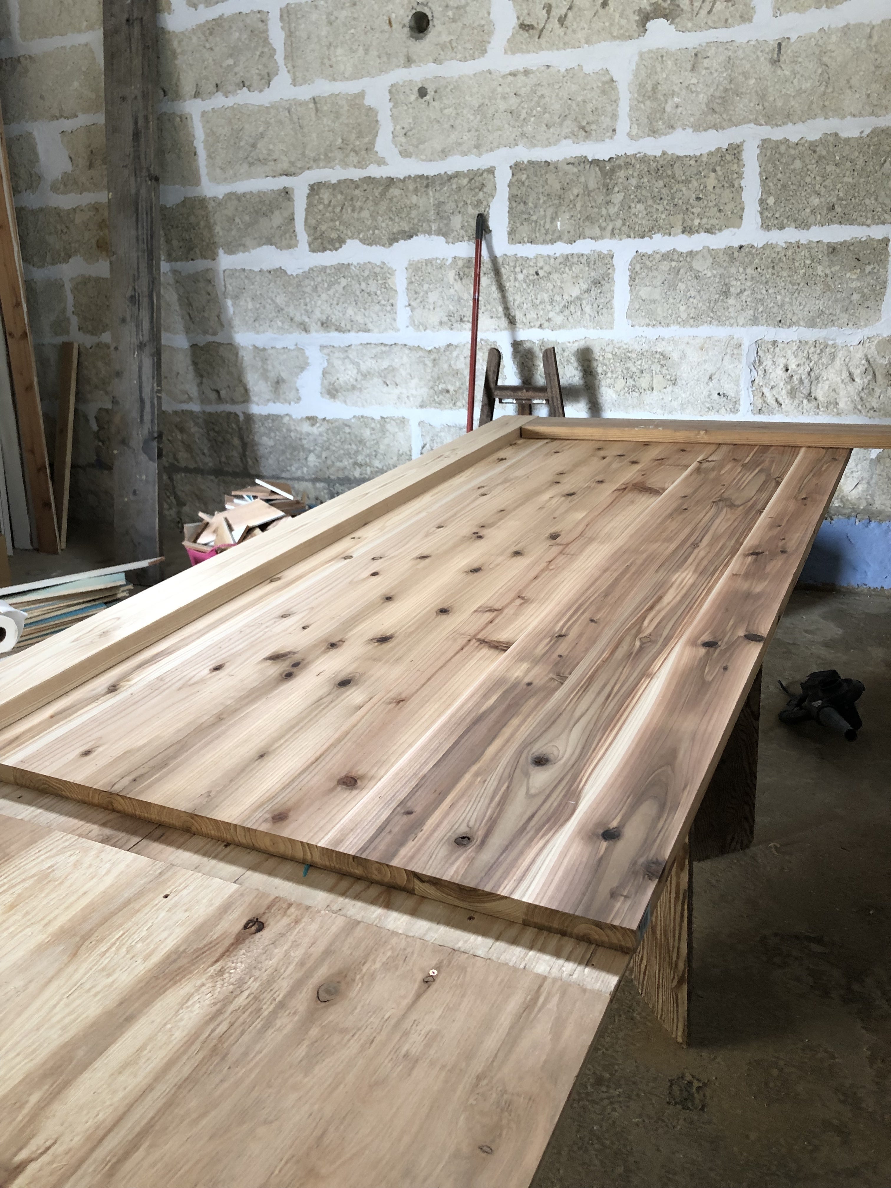 今日はダイニングテーブルを作りました。買うとやはりそれなりのお値段になり、少しでも大事に資金を回していきたいので、杉の無垢材をホームセンターで購入。