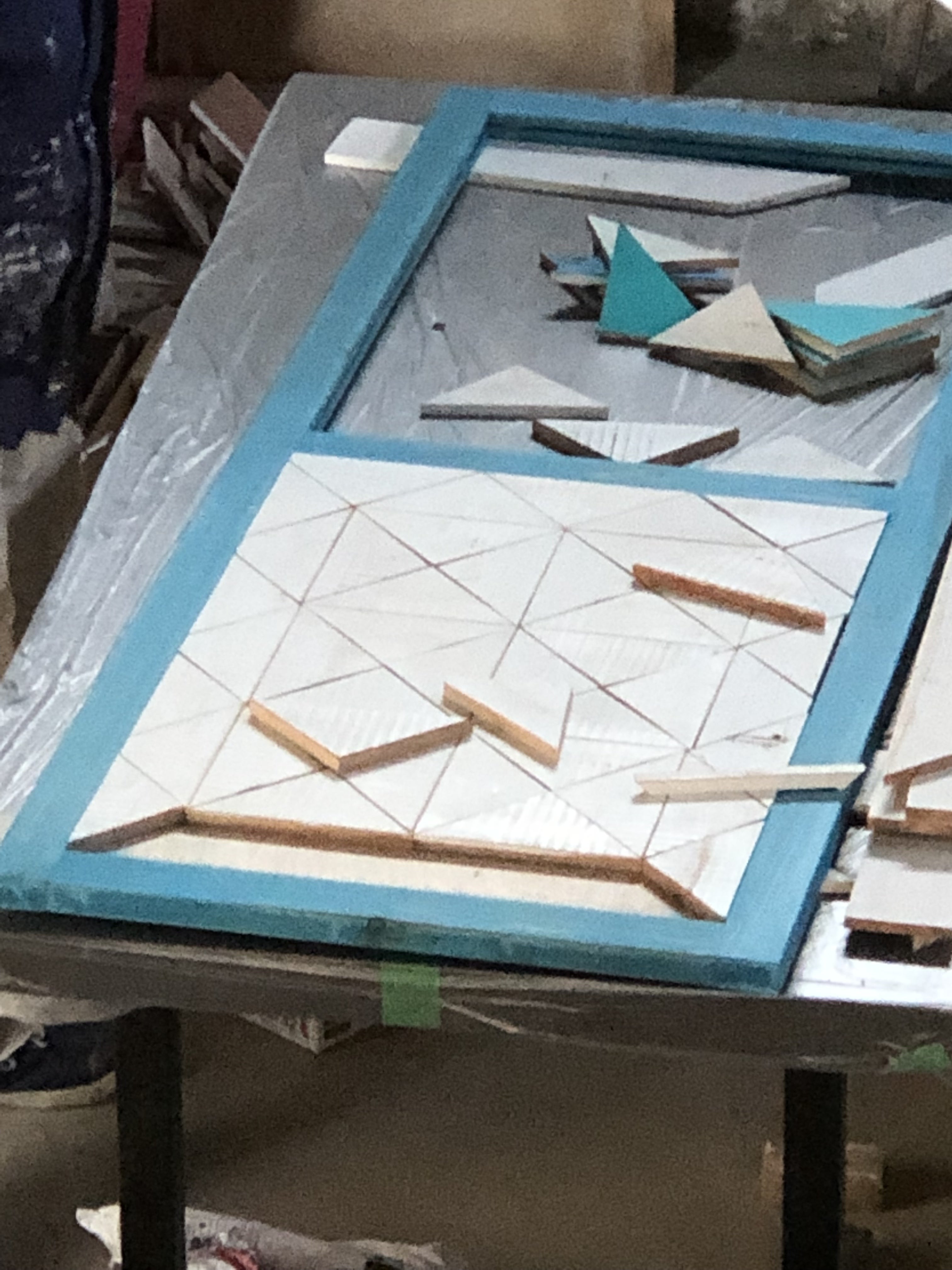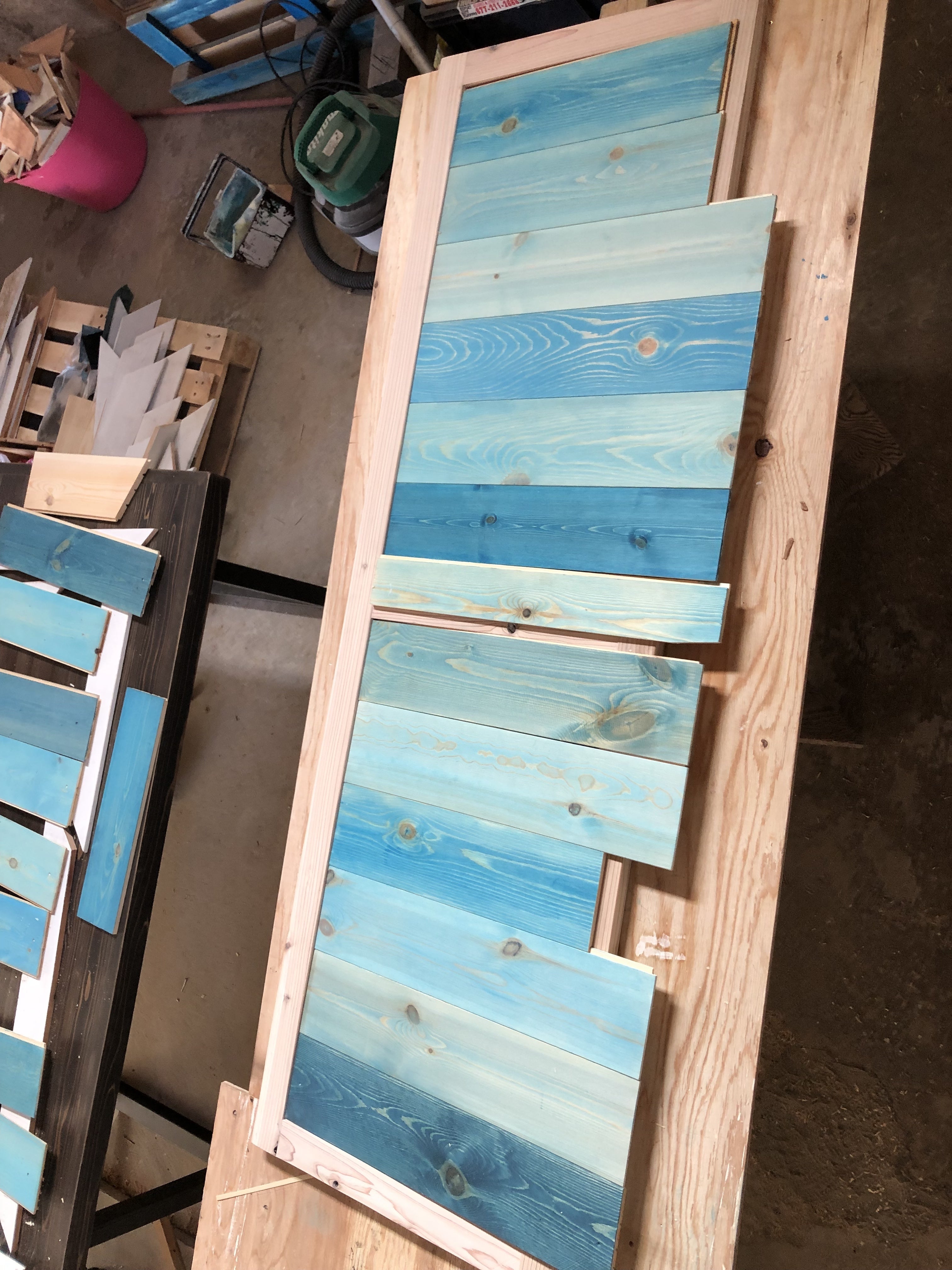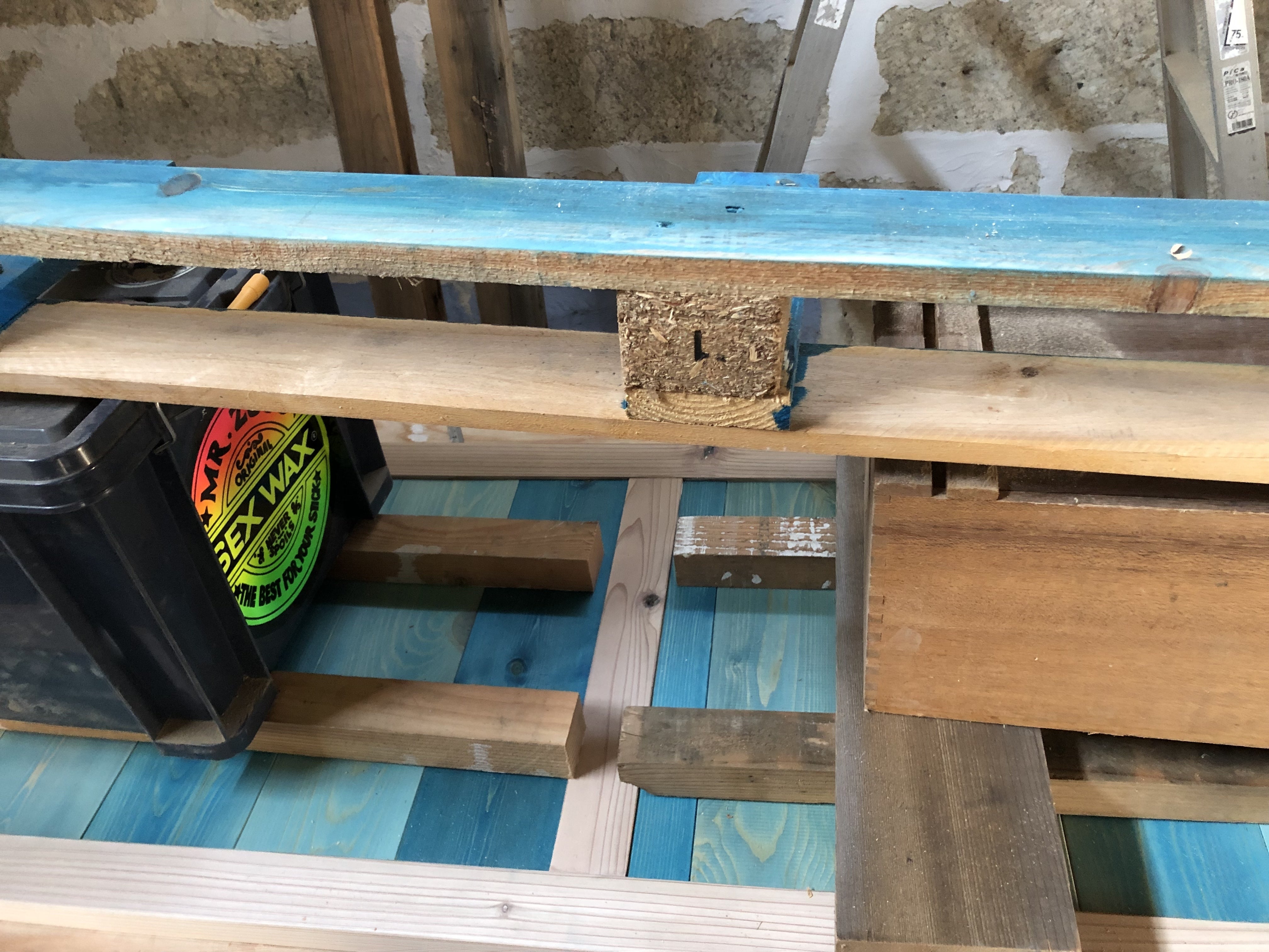 前回試し塗りした余り物の板を薄くして、接着! 重石を置いて只今接着中。