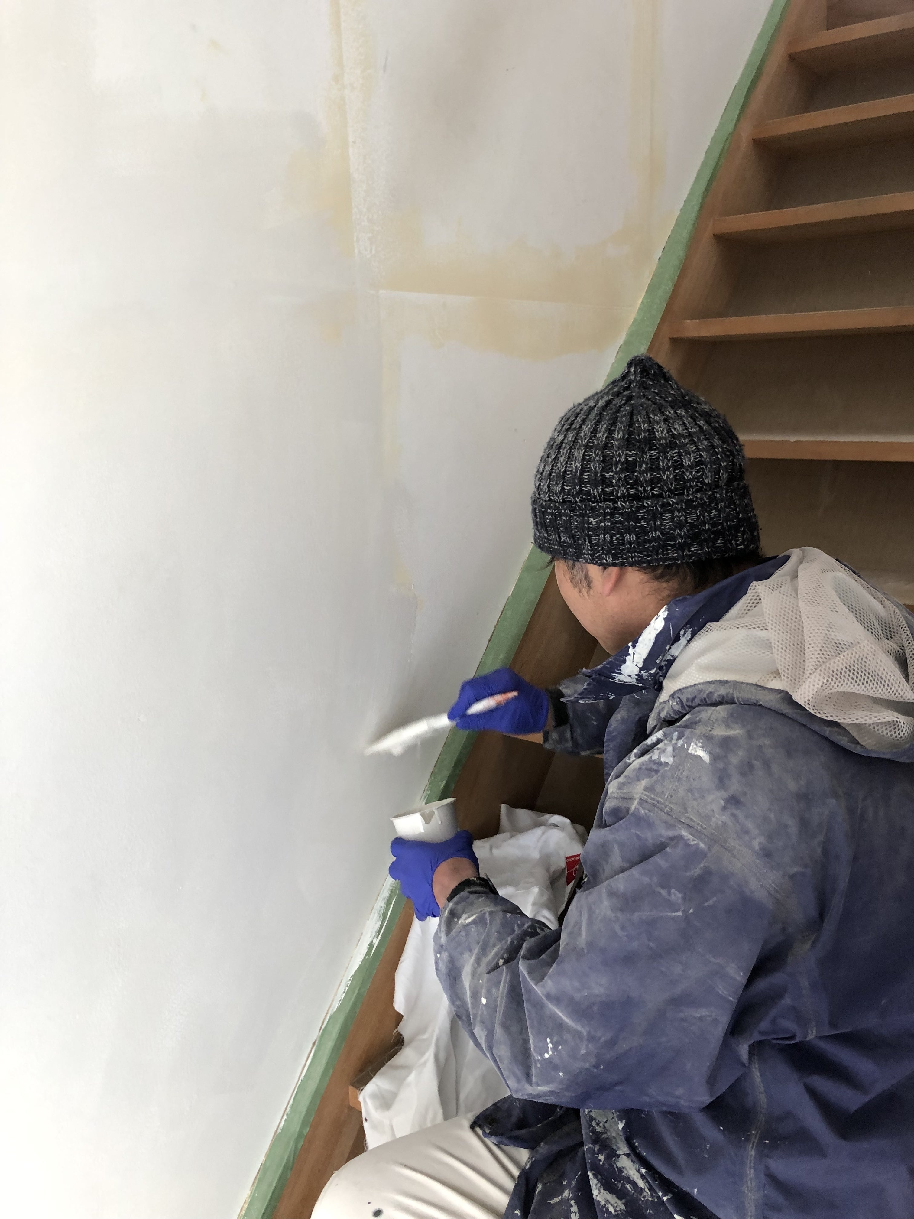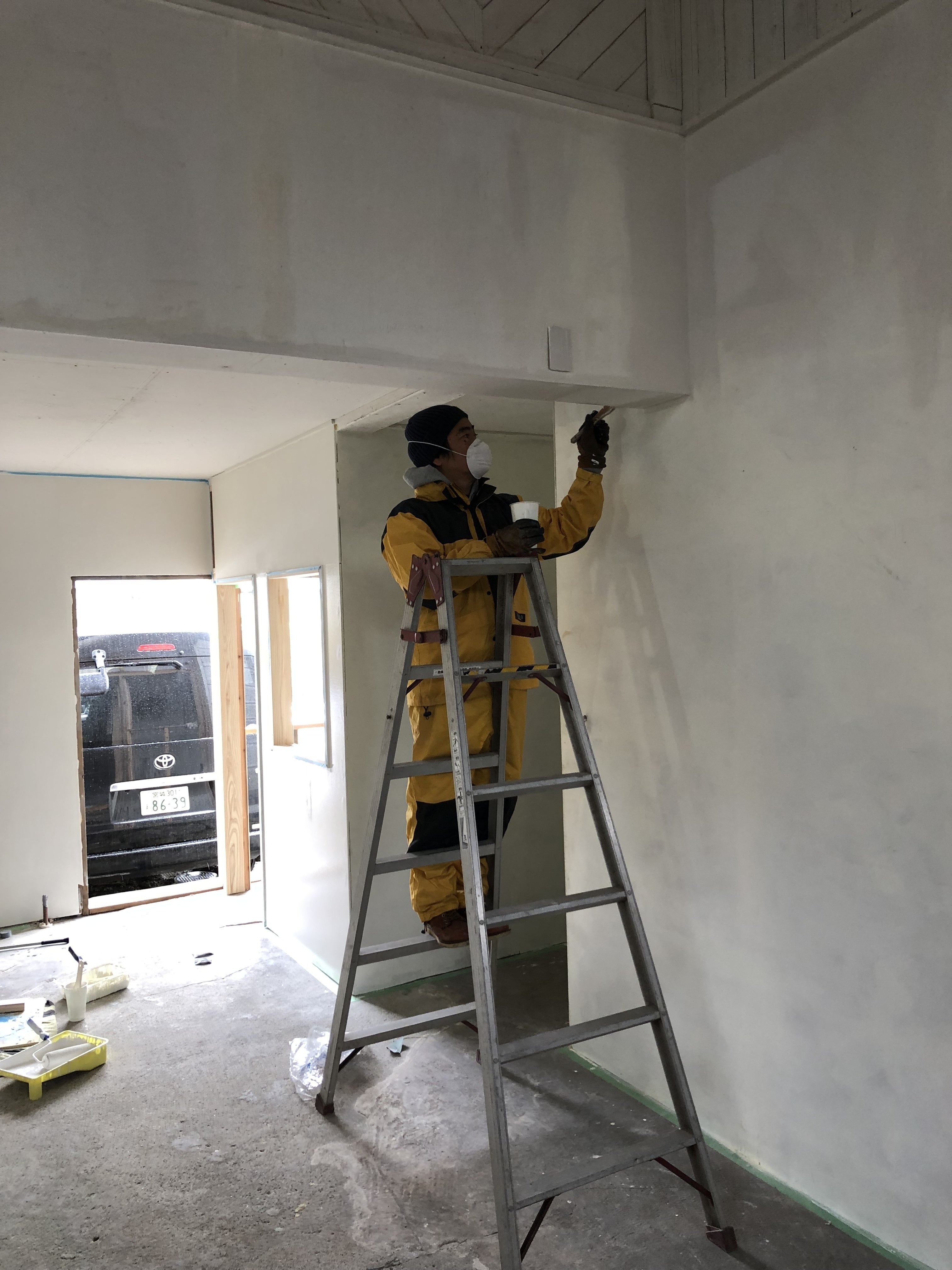 今日も朝からお助けマンズのおかげで急ピッチでペンキ塗りと漆喰塗りが進みました!