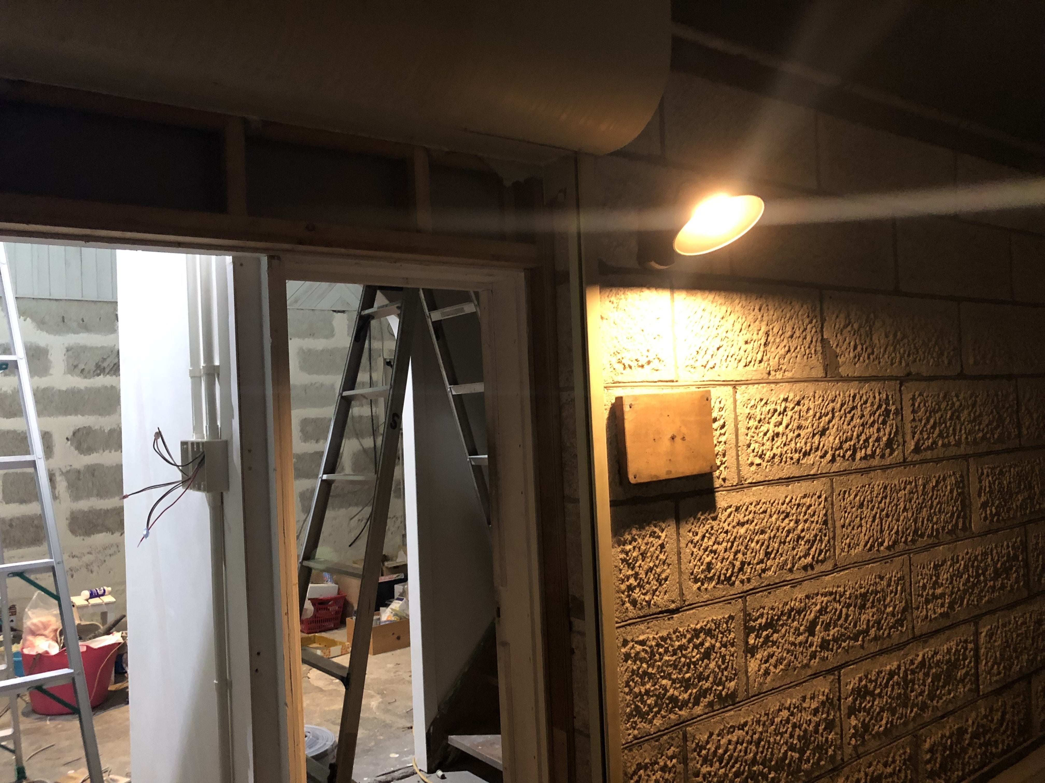 さりげない灯でいい感じです!今夜ももうすぐ8時になりますが、電気屋さんまだ頑張ってくれています! 夕方、鳥が迷い込んでしまって蔵の中で困っています。 作業が終わったら、鳥の救出作戦です。