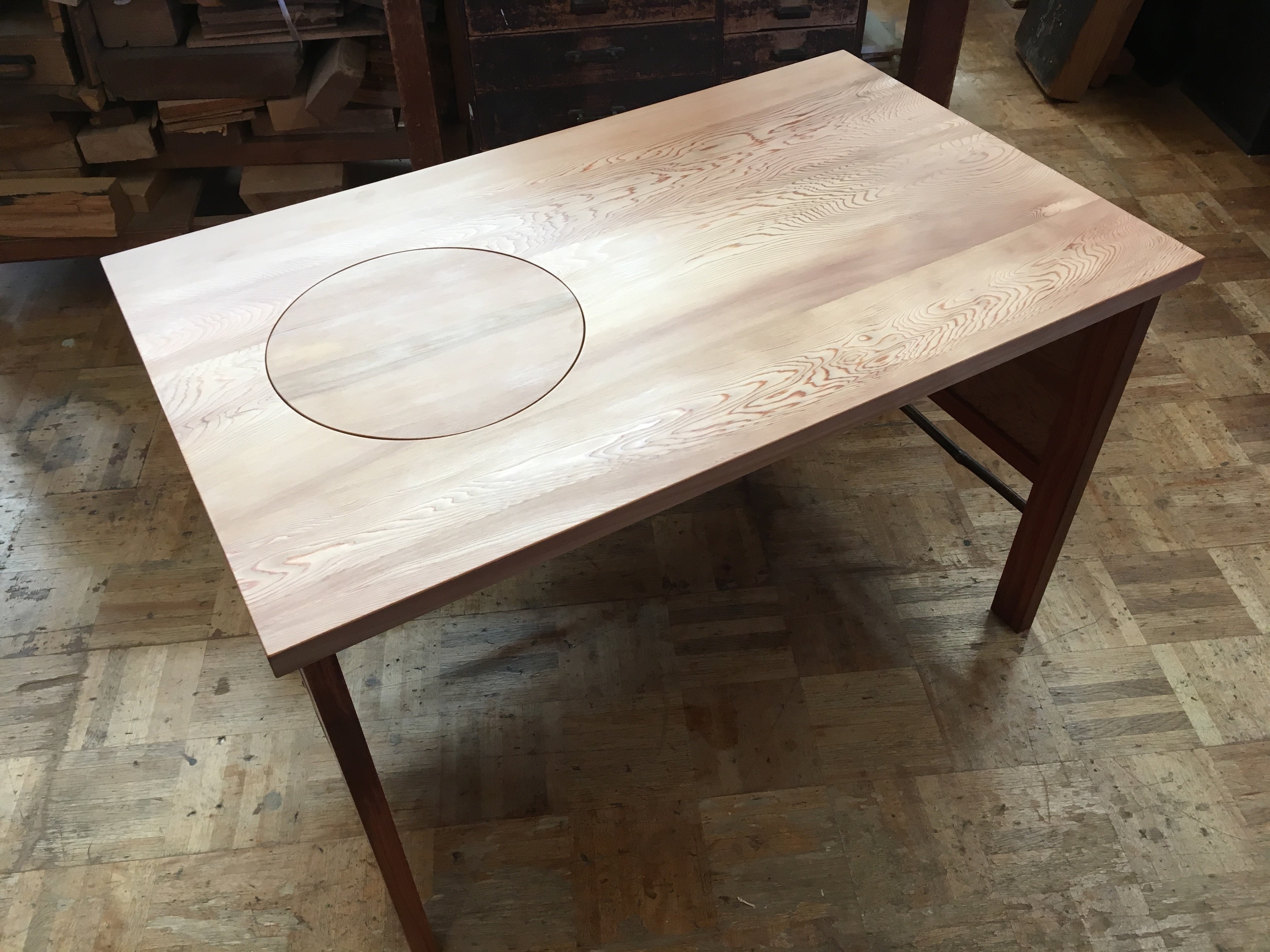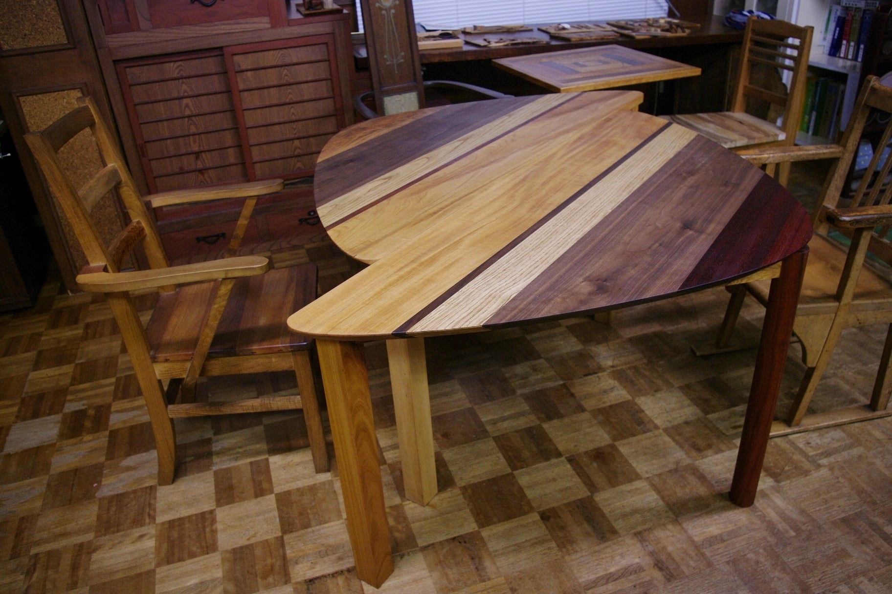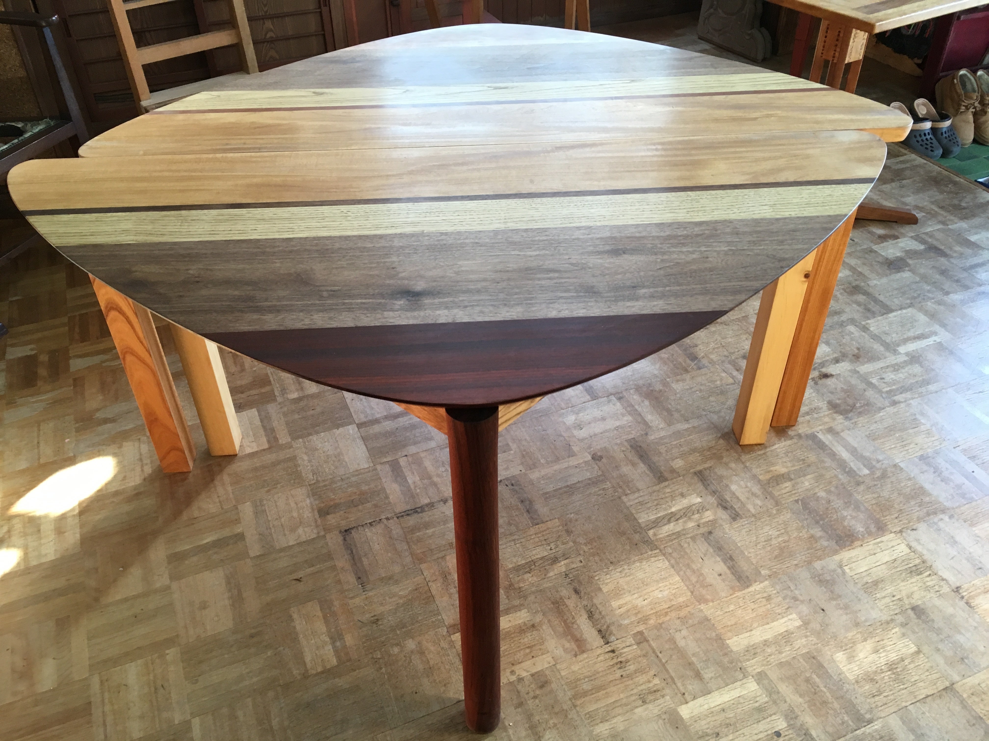 ●こちらのセパレートテーブルは5種類の天然杢の木を組み合わせて、木の組み合わせはの接着は雇いザネと呼ばれる指物の手法で剥ぎ合せてあり、脚の丸い部分は木工旋盤が無いので手作業で手鉋でコツコツ削り出しています。